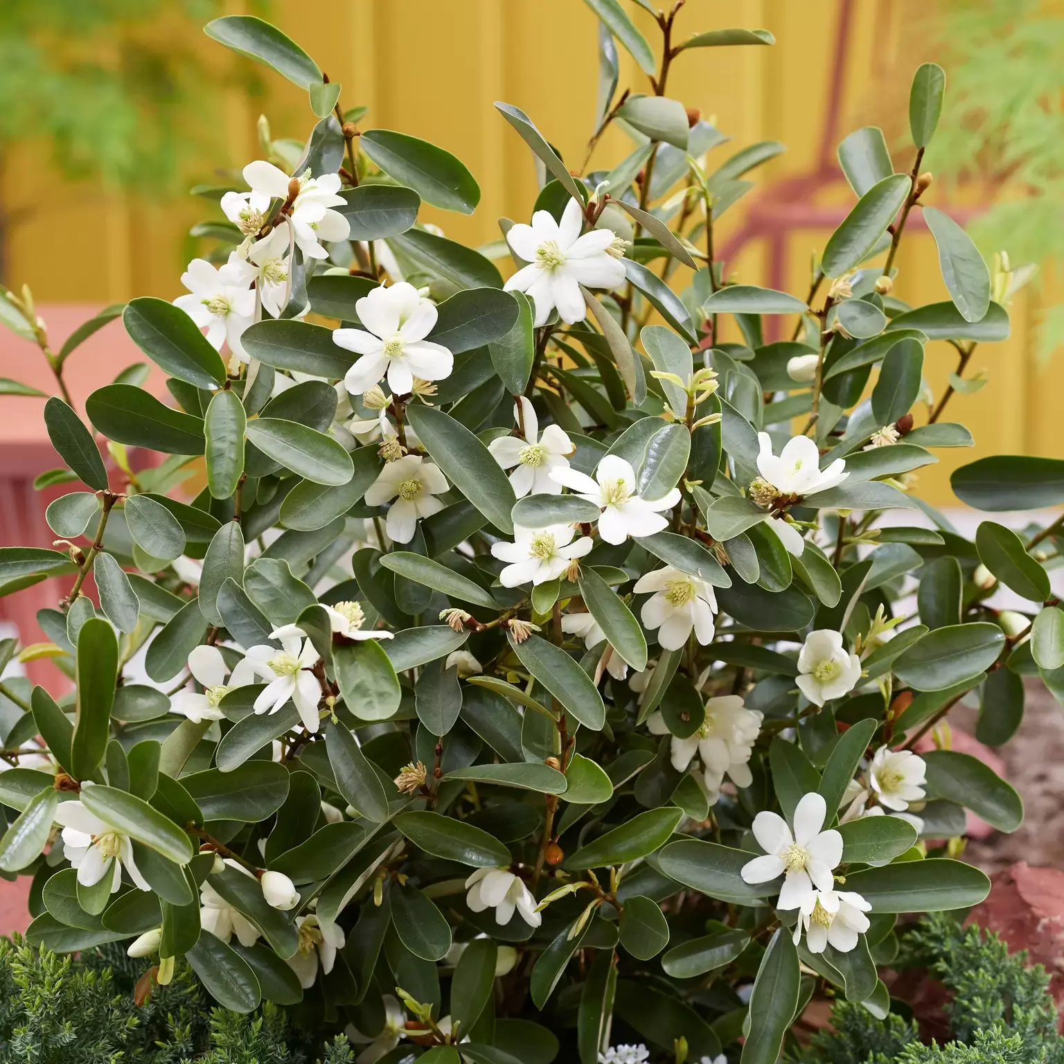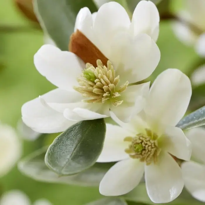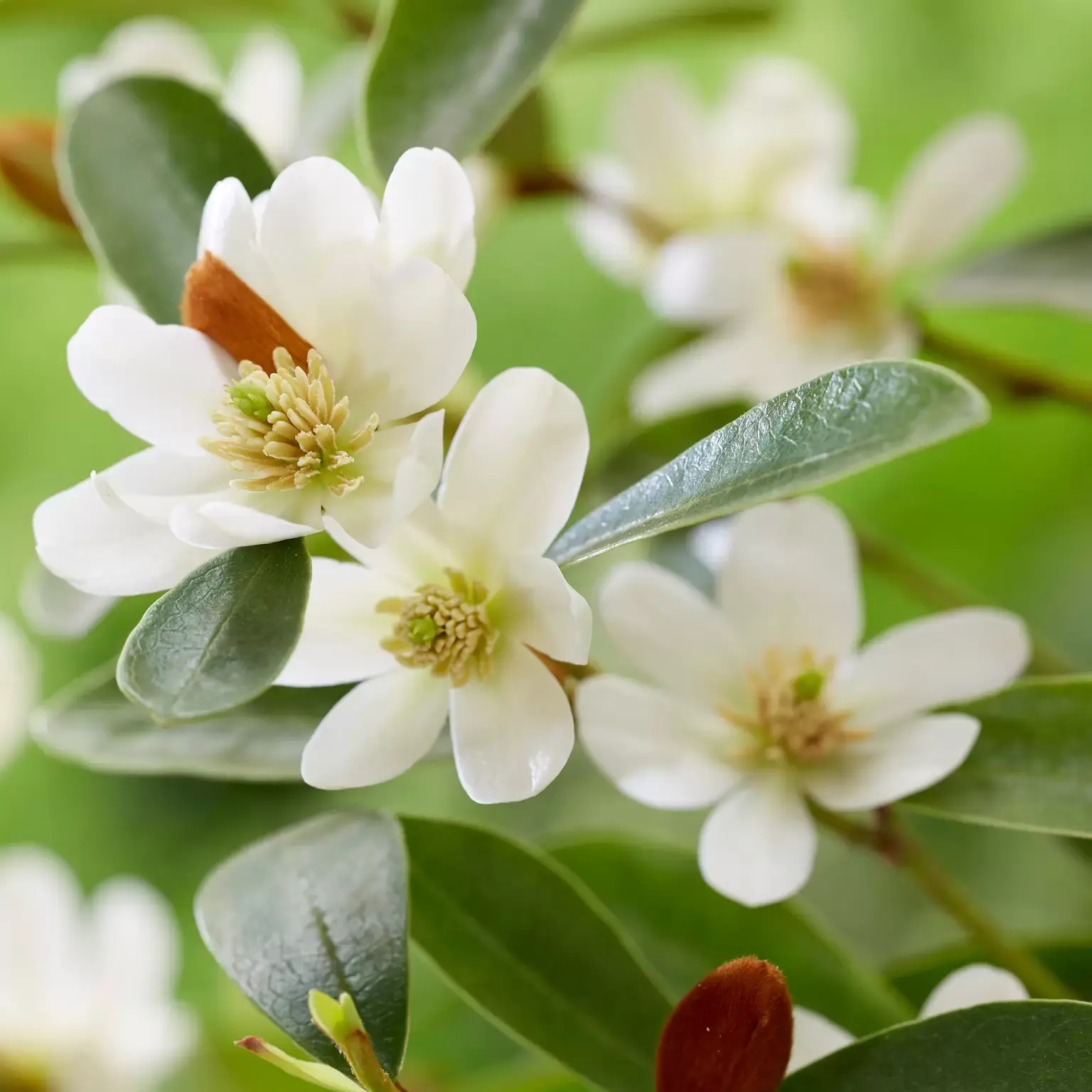 Magnolia laevifolia 'Miniatura' is a delightful dwarf evergreen magnolia forming a neat, densely branched, rounded shrub. Its glossy, dark green, leathery foliage provides year-round structure and makes it a superb choice for smaller gardens or decorative container planting.