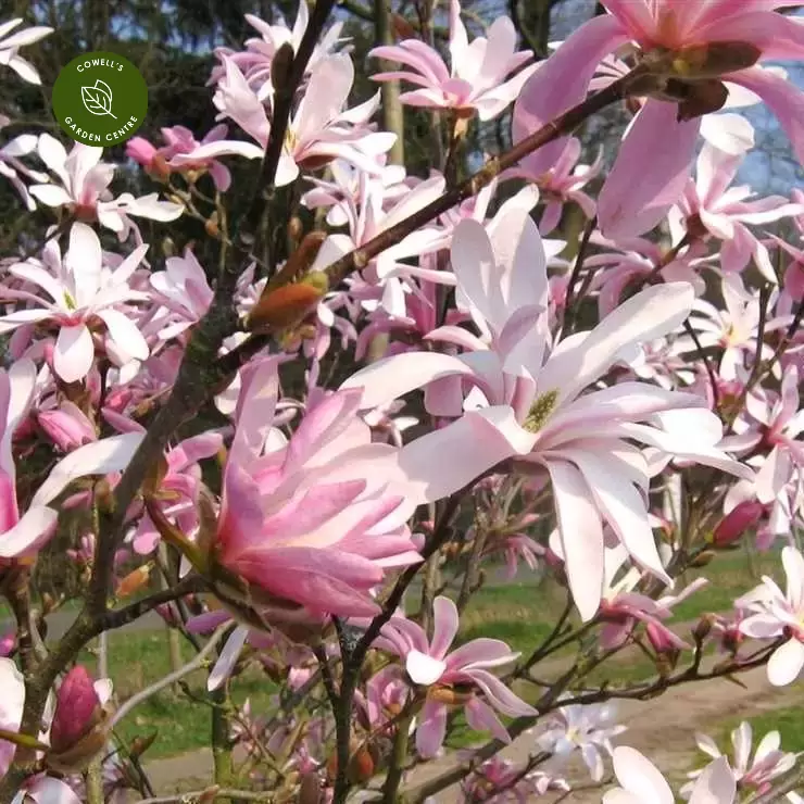 Magnolia loebneri 'Leonard Messel' is a beautifully refined magnolia developed at Nymans Gardens in Sussex, valued for its elegant spring display and graceful habit. In early spring, it produces masses of star-shaped flowers, each with slender petals opening pale pink to white, highlighted by deeper pink-purple outer surfaces for added contrast.
