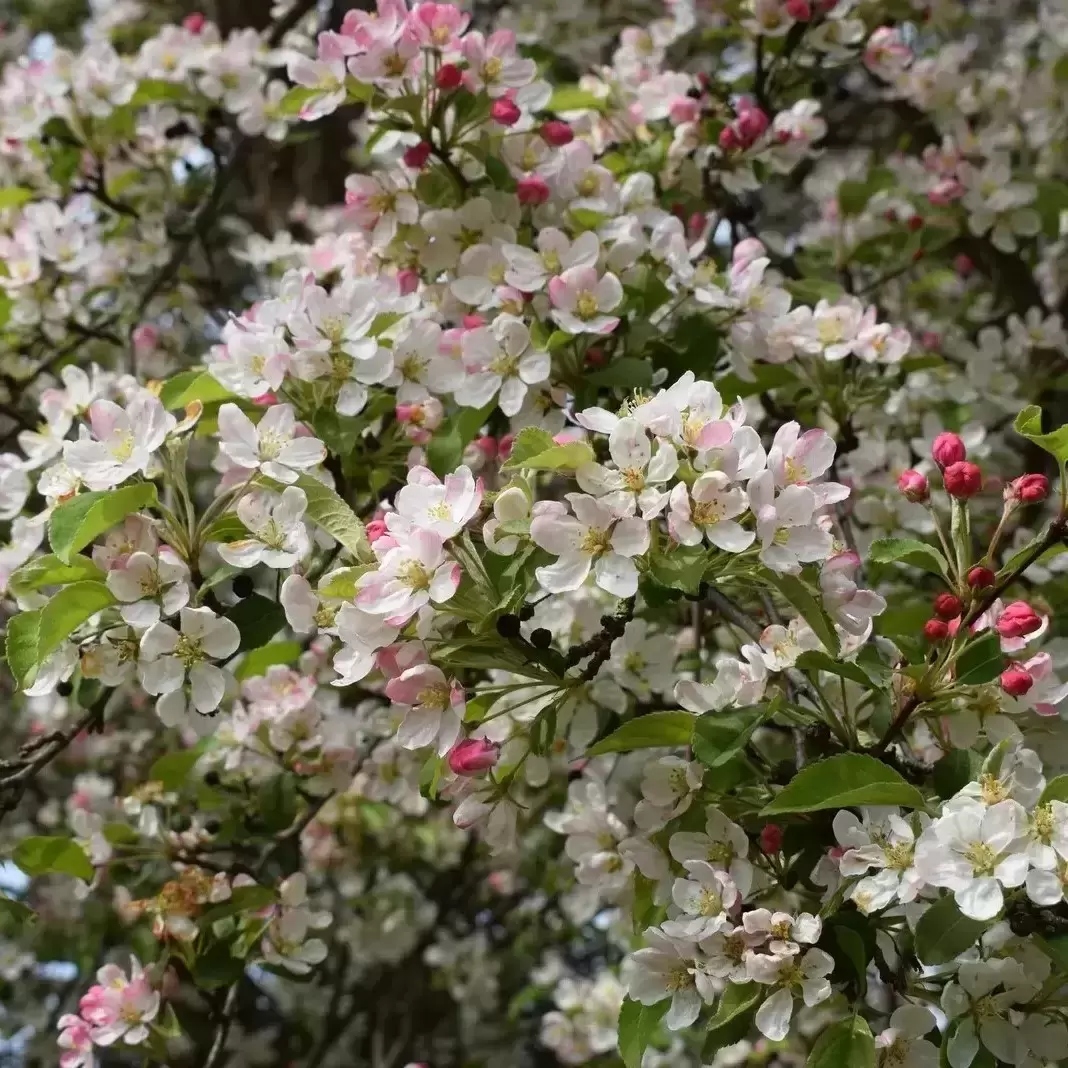 Malus floribunda, commonly known as the Japanese Crab Apple, is one of the most ornamental of flowering crab apples. In spring, its branches are smothered with masses of carmine-pink buds that open to fragrant, pale pink blossoms, fading almost to white. The flowers are highly attractive to pollinators and create a dazzling seasonal display.