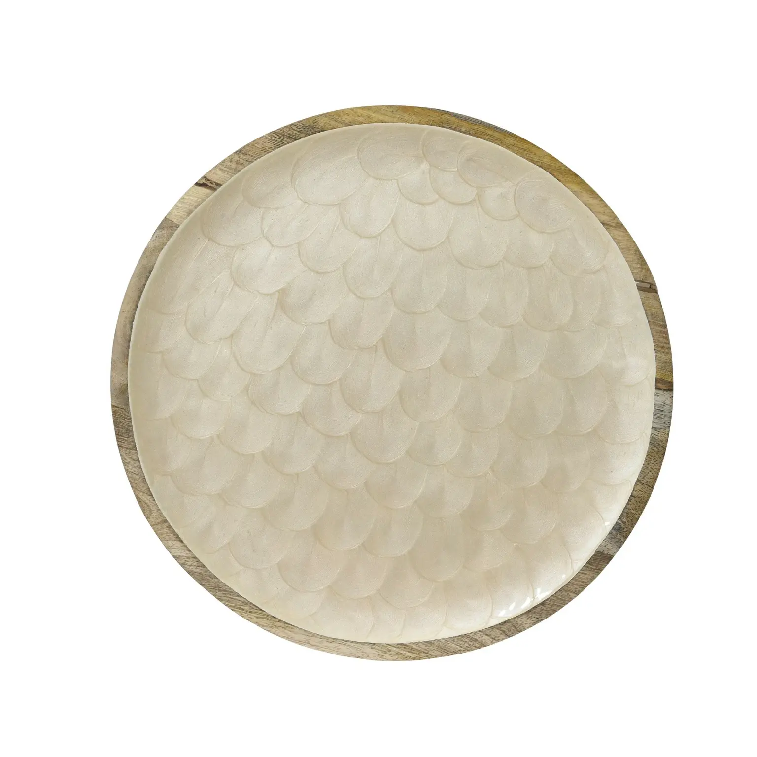 An elegant mango wood plate with a smooth, scallop patterned cream interior and natural wood exterior, combining practicality with timeless style for everyday dining, serving or for decoration.