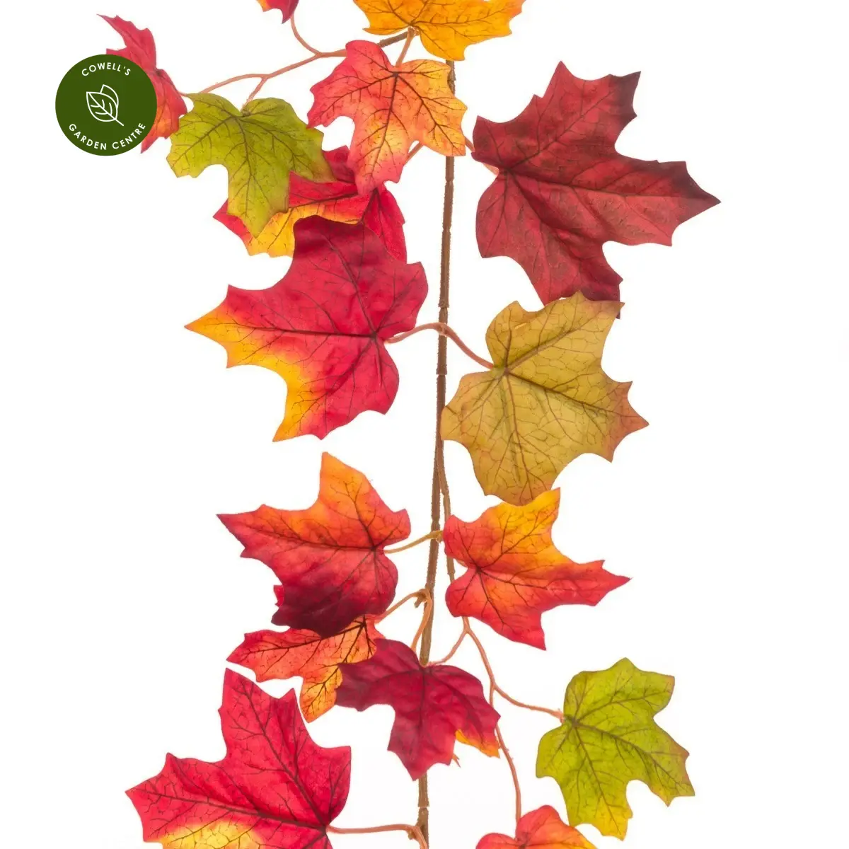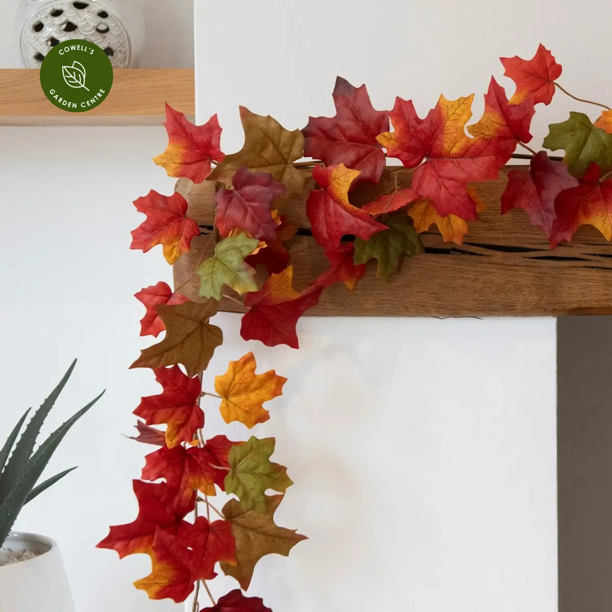 Artificial foliage garland with warm tones of Autumnal reds, oranges and greens.