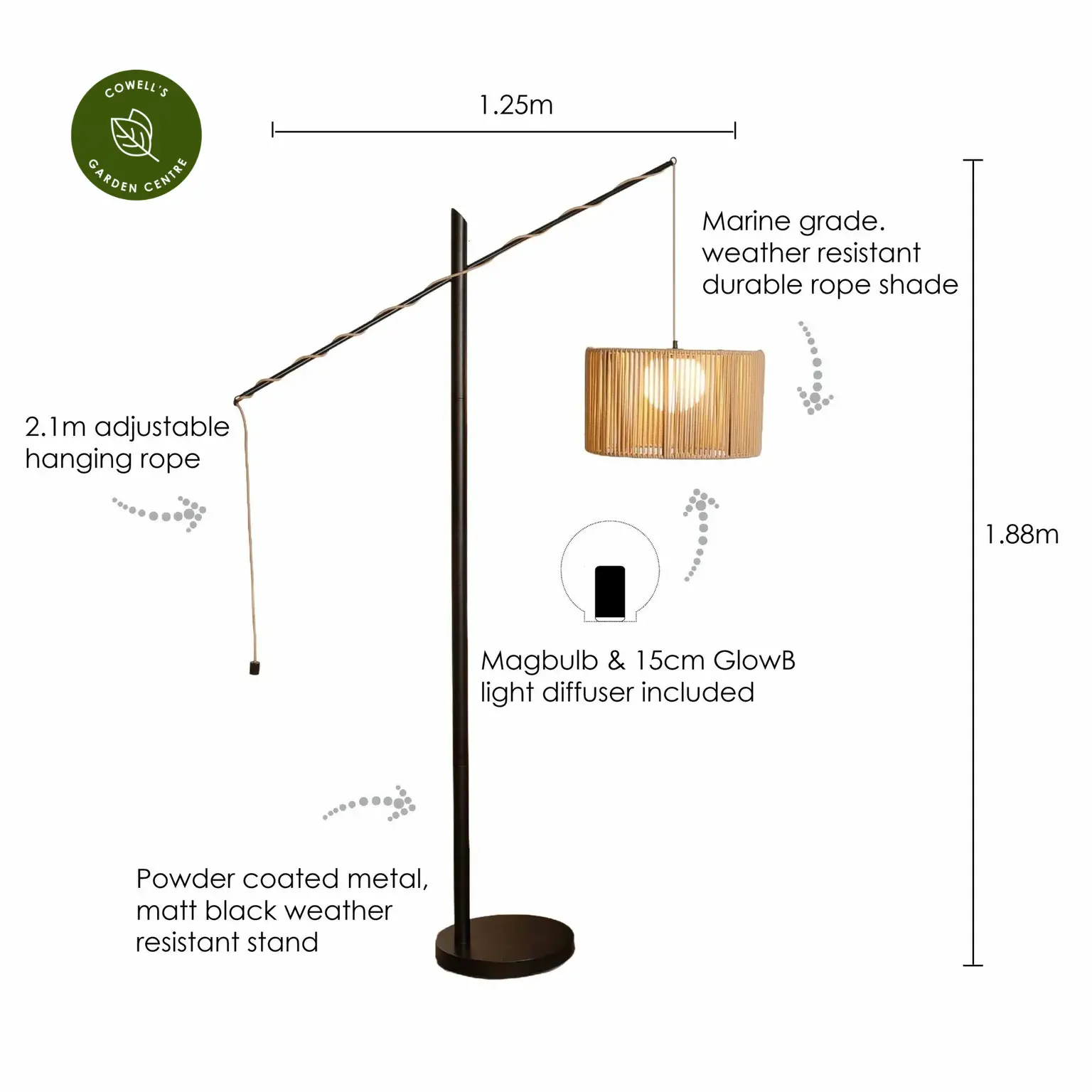 Designed for outdoor living, the Matera Latte Rope Floor Lamp brings warm, ambient lighting and contemporary style to patios, decks and garden seating areas. Standing 188cm tall, it creates a soft glow that enhances outdoor spaces without overpowering them.