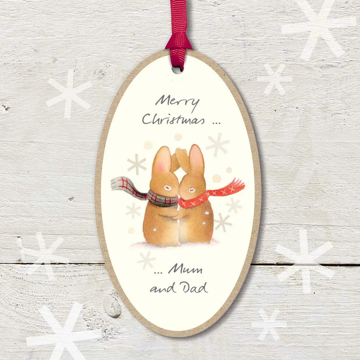 Christmas Wooden Plaque with attached red ribbon, featuring a cute rabbit couple cuddling and wearing scarves, with a ’Merry Christmas Mum and Dad’ caption. Perfect as a gift or to decorate the home.