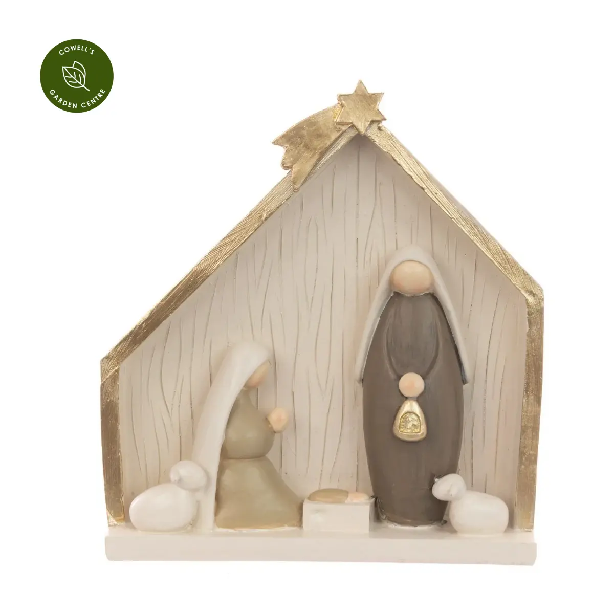 Simple resin nativity scene featuring Mary, Joesph, baby in a manger and two sheep.