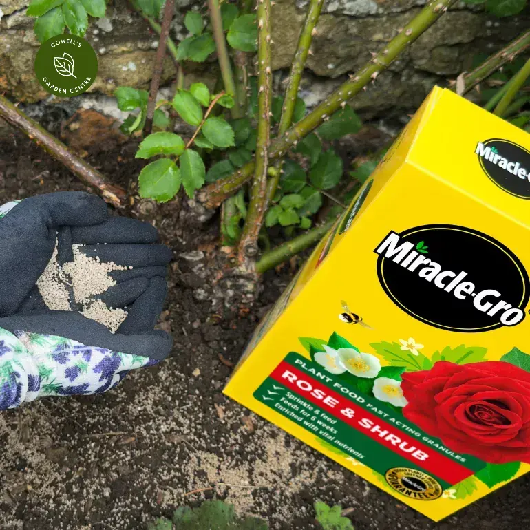 Established roses and shrubs: Evenly scatter 1-2 handfuls of granules around the base of each bush, over the whole rooting area. Lightly work into the soil.