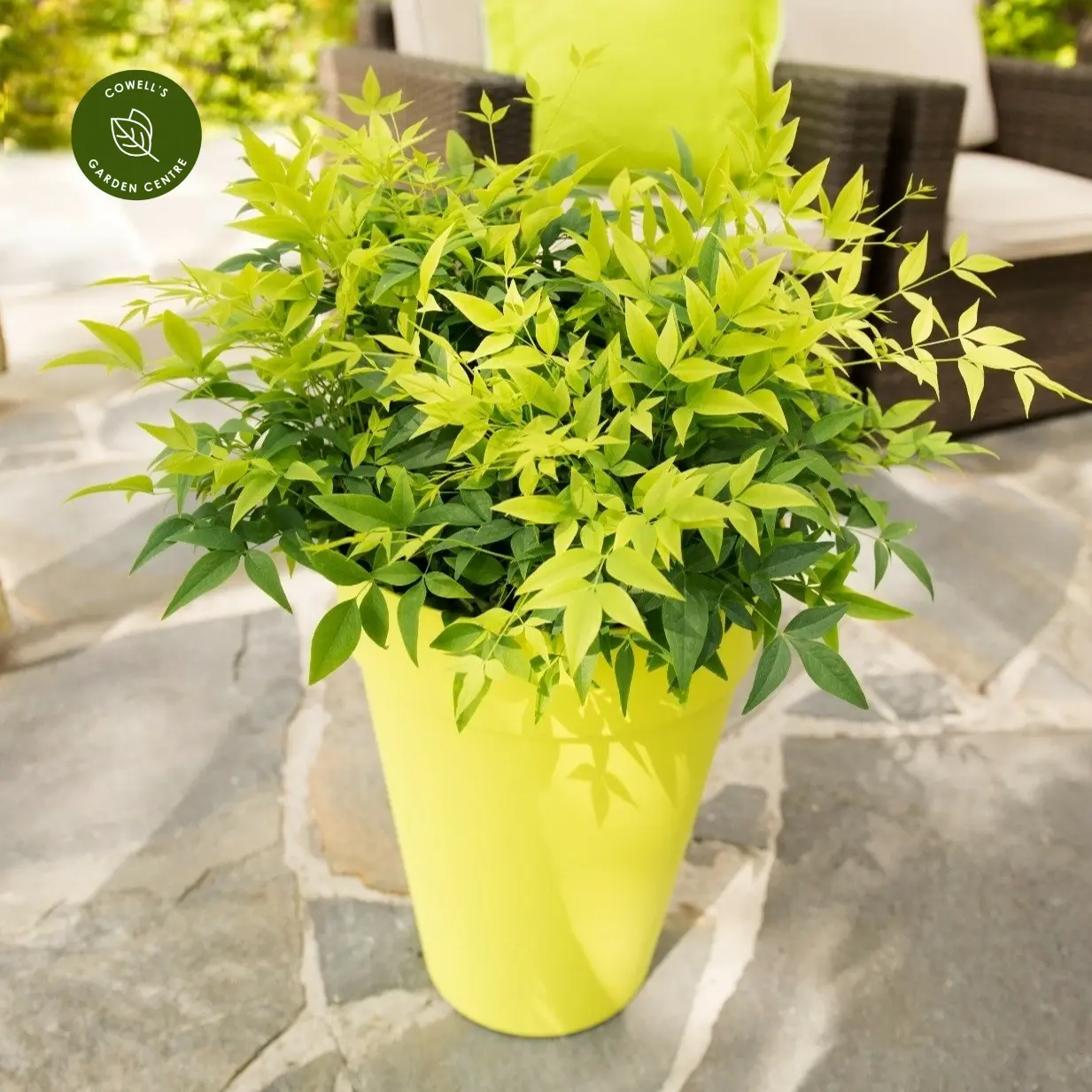 Nandina domestica 'Lemon Lime' is a striking evergreen shrub valued for its vivid foliage display. In spring, the leaves emerge a bright yellow-green before maturing into a vibrant lime shade through summer and autumn. In sunnier positions the foliage retains its glowing brightness, while in shadier spots it takes on a deeper green tone, offering flexibility in different planting situations.