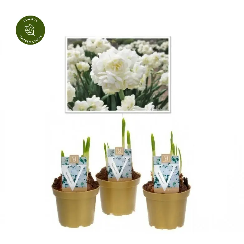 Narcissus 'Paperwhite Erlicheer' is an exquisite double-flowering Paperwhite producing clusters of creamy white blooms with soft lemon centres. Each stem carries multiple rosette-like flowers, creating a richly layered, fragrant display from winter into early spring. Its strong perfume and elegant form make it a favourite for indoor forcing as well as sheltered outdoor planting.