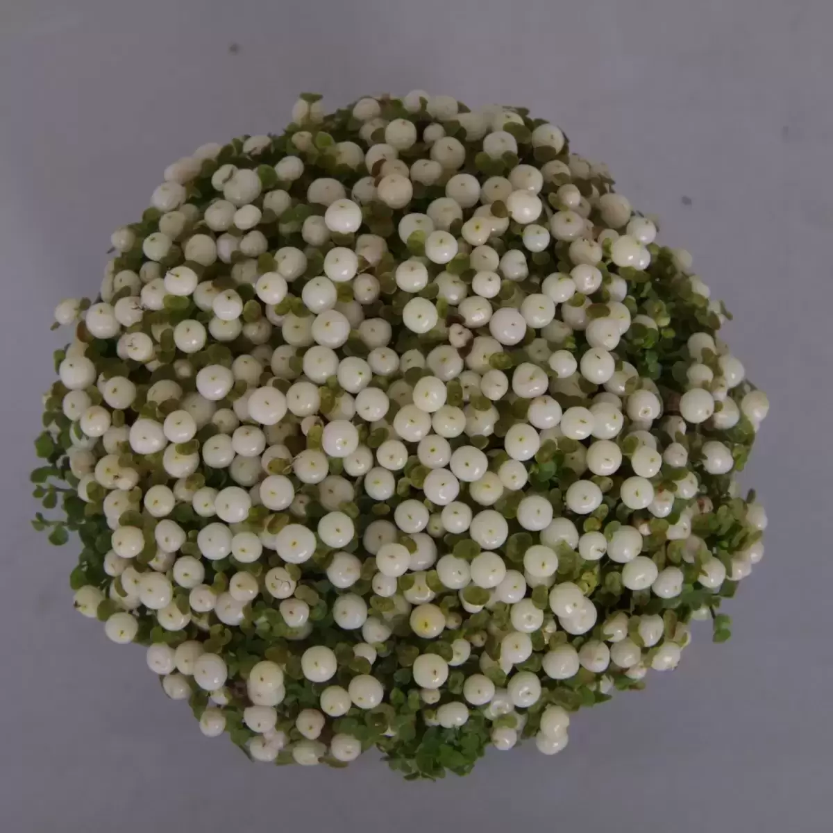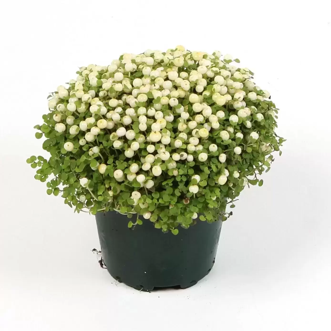 Nertera granadensis 'White' is a charming groundcover-style houseplant grown for its tiny, glossy green leaves and masses of white berries that appear in summer. Compact and eye-catching, it brings cheerful colour and texture to windowsills, desks, or decorative bowls.
