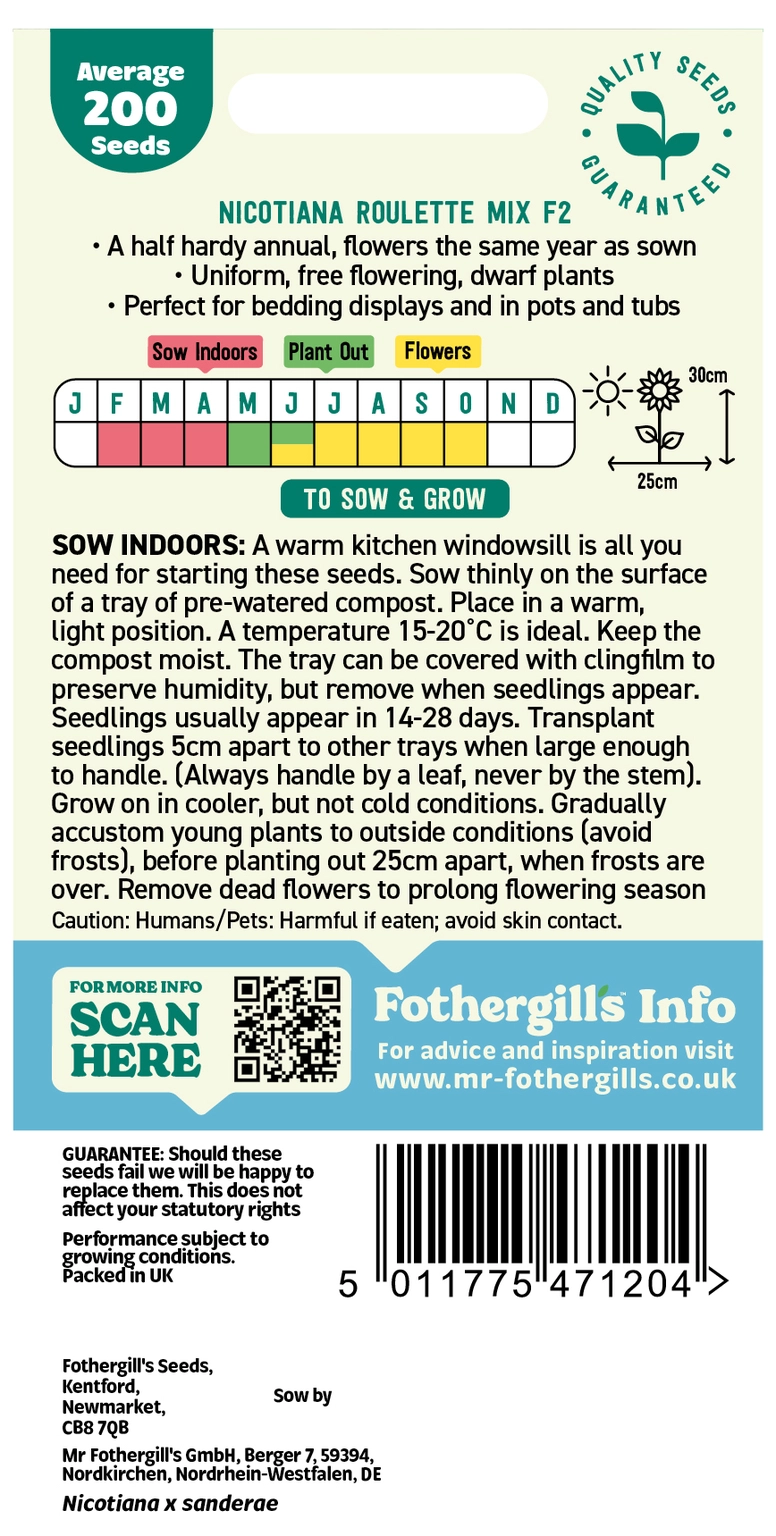 Ideal for containers and bedding. Remove dead flowers to prolong flowering season. The seed of Nicotiana is very small, for easier sowing, mix it with a little dry sand
