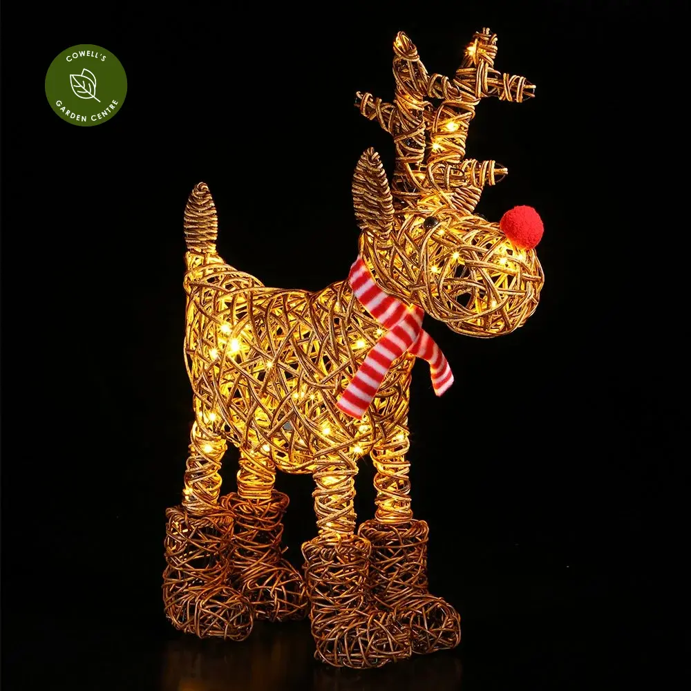 Cute Wicker Rudolf with boots and striped scarf. Featuring warm white LEDs with 8 different lighting functions. Suitable for indoor and outdoor use and battery operated, making this an ideal table top or doorstep decoration.