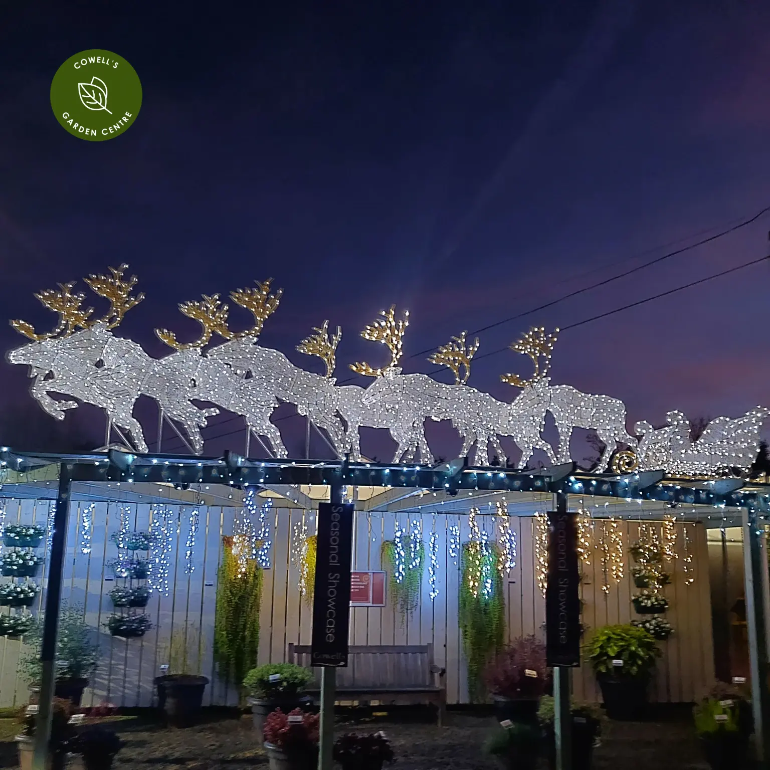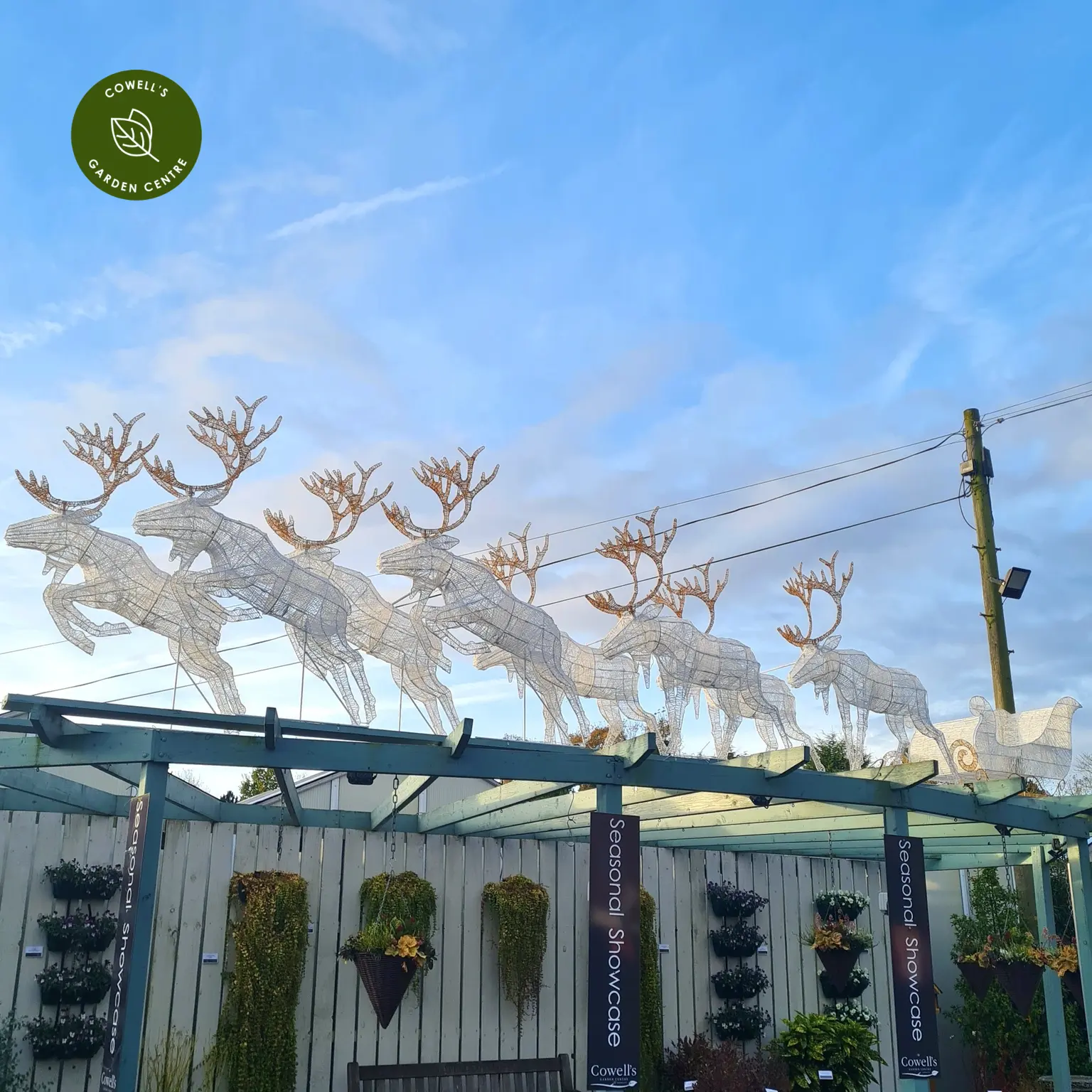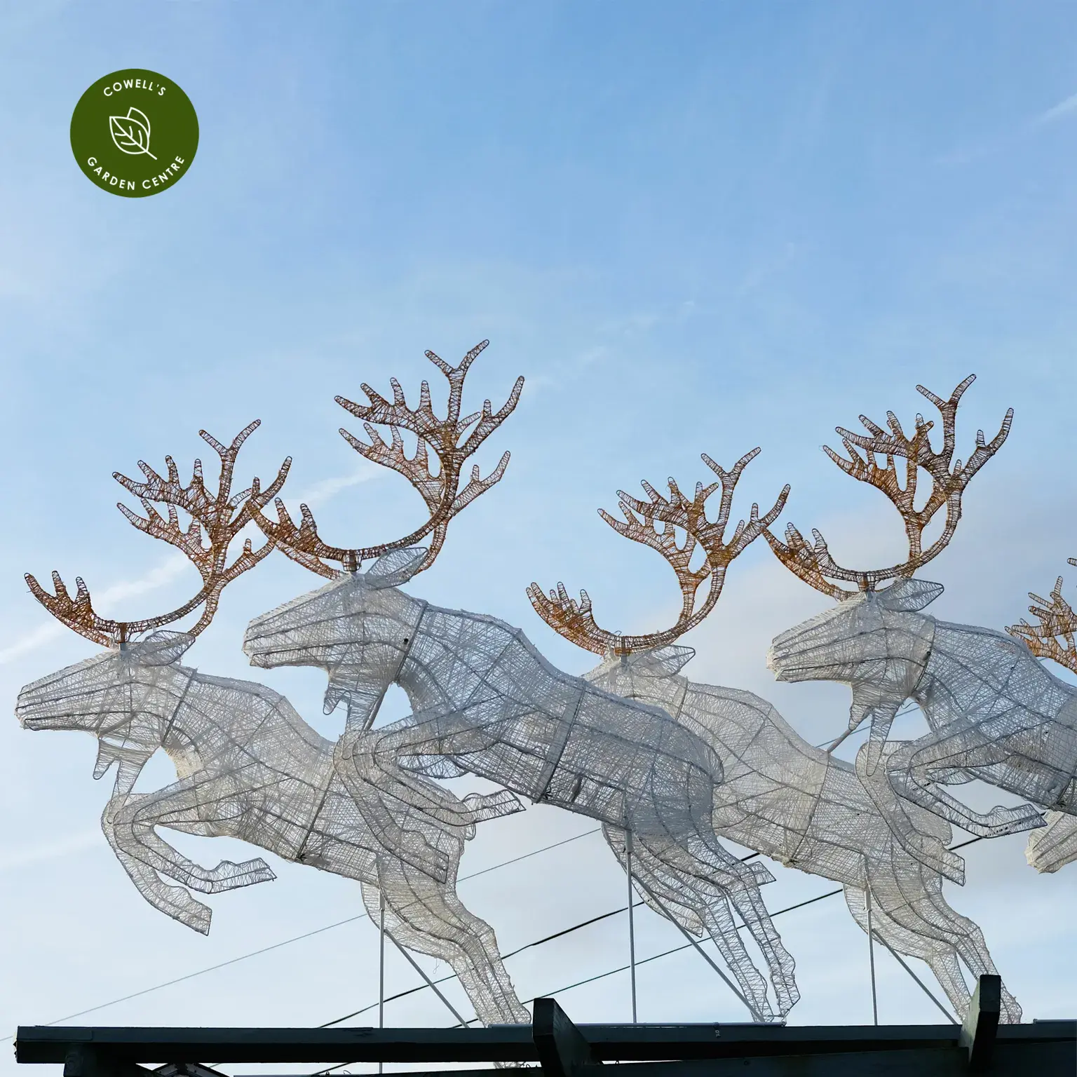 Stunning display to add some magic to Christmas. Depicting eight reindeer taking off into the night sky, pulling a sleigh, with warm and cool light settings.