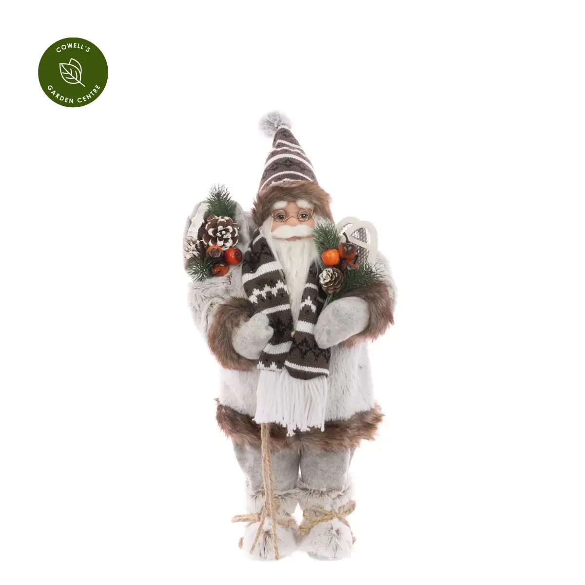 Standing Santa figurine dressed in soft cosy clothing for the winter weather, bringing festive charm to your home.