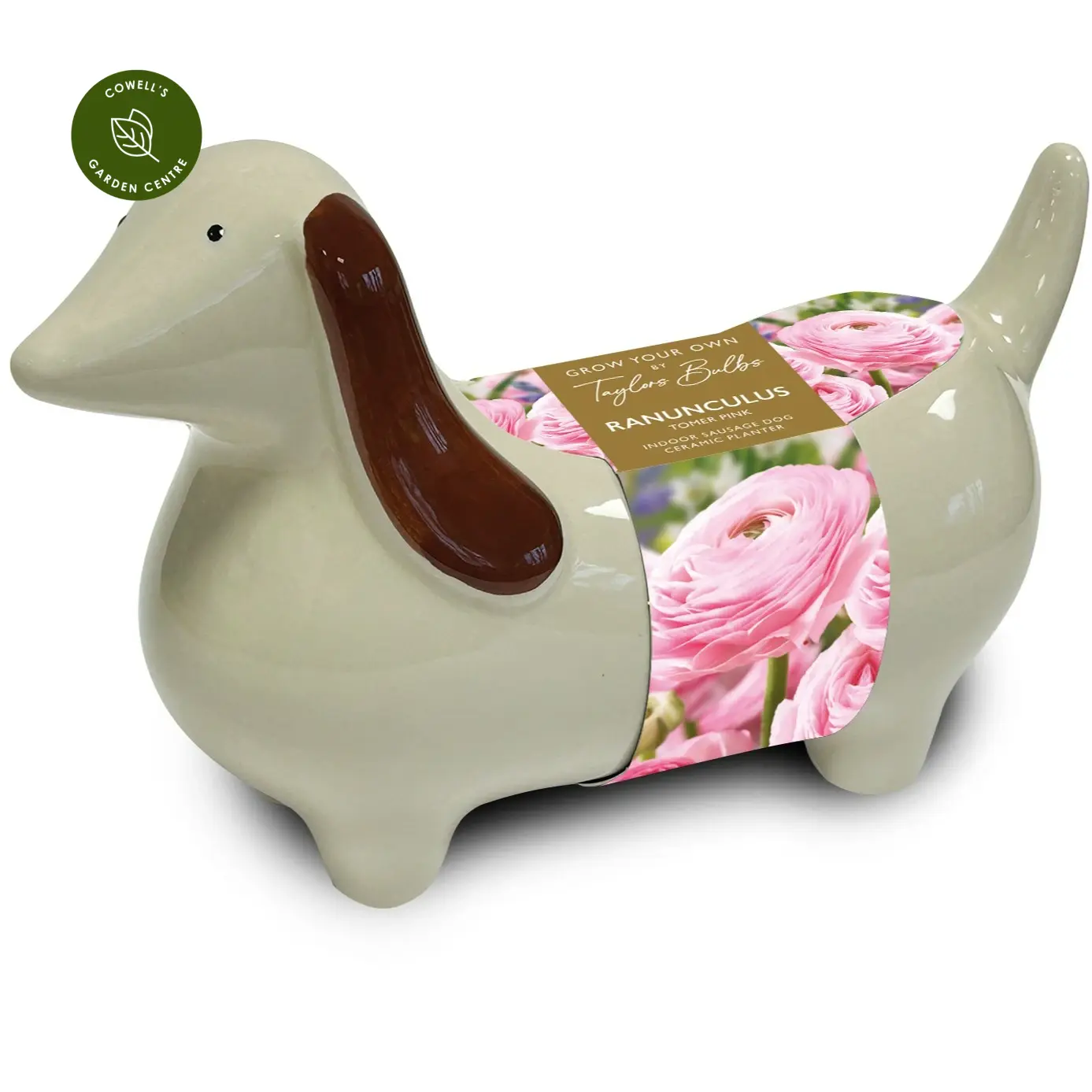 A ceramic sausage dog planter complete with 3 x Ranunculus 'Tomer Pink' bulbs, compost and growing culturals.
