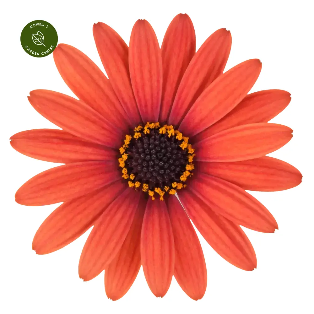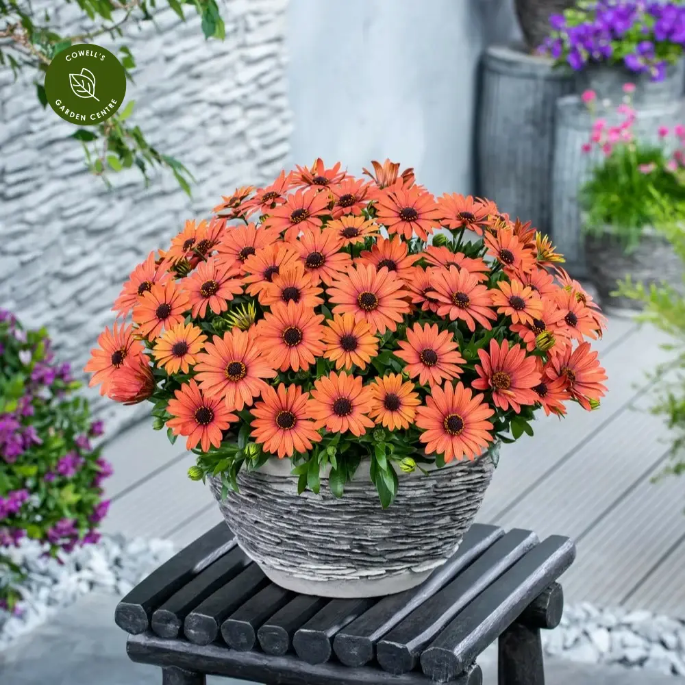 Osteospermum 'Dalina® Orange Brique' is a striking, free-flowering variety producing warm terracotta-orange blooms with dark centres. Its rich, sunset tones bring depth and warmth to summer planting schemes.