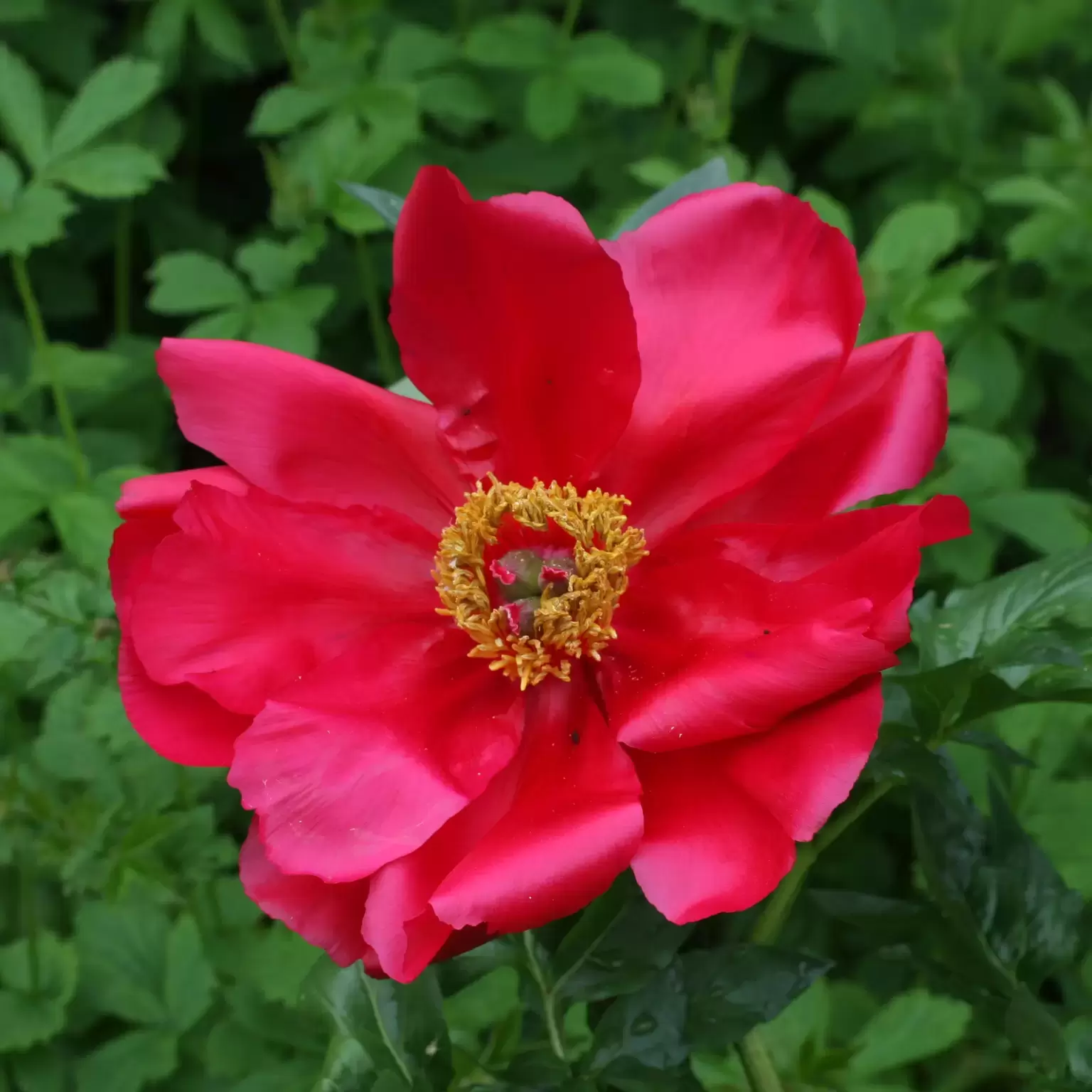 Paeonia lactiflora 'Blaze' is a vigorous and reliable herbaceous peony producing bold, bright red single flowers on strong, upright stems in early summer. The rich red petals surround a central cluster of golden stamens, creating a striking contrast that stands out beautifully in mixed borders.