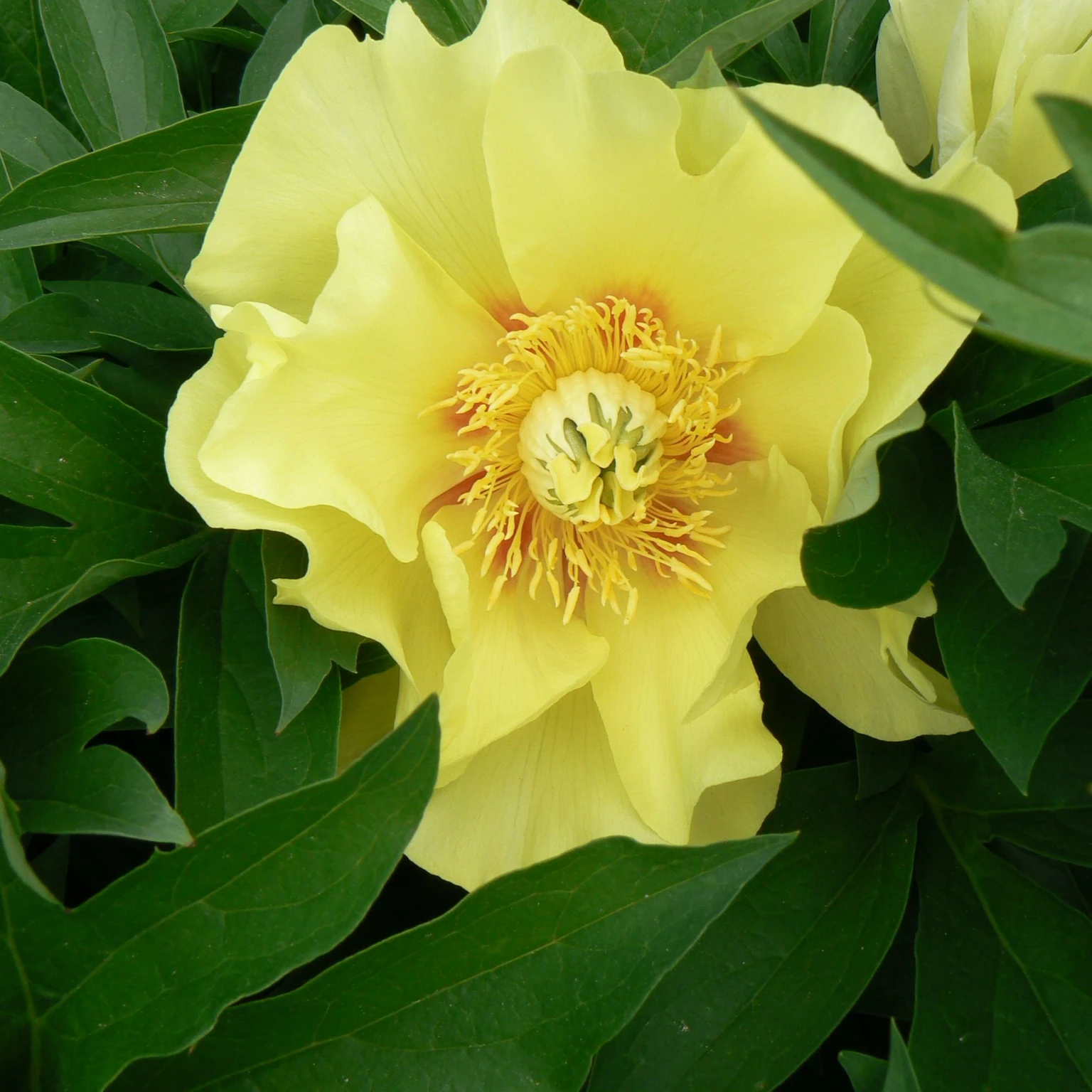 Paeonia x hybrida 'Going Bananas' is a vibrant Itoh (Intersectional) peony, renowned for its abundant semi-double blooms in a cheerful soft lemon-yellow. Each flower can show gentle apricot tones at the base of the petals and a bright cluster of golden stamens, creating a lively and uplifting display in late spring to early summer.