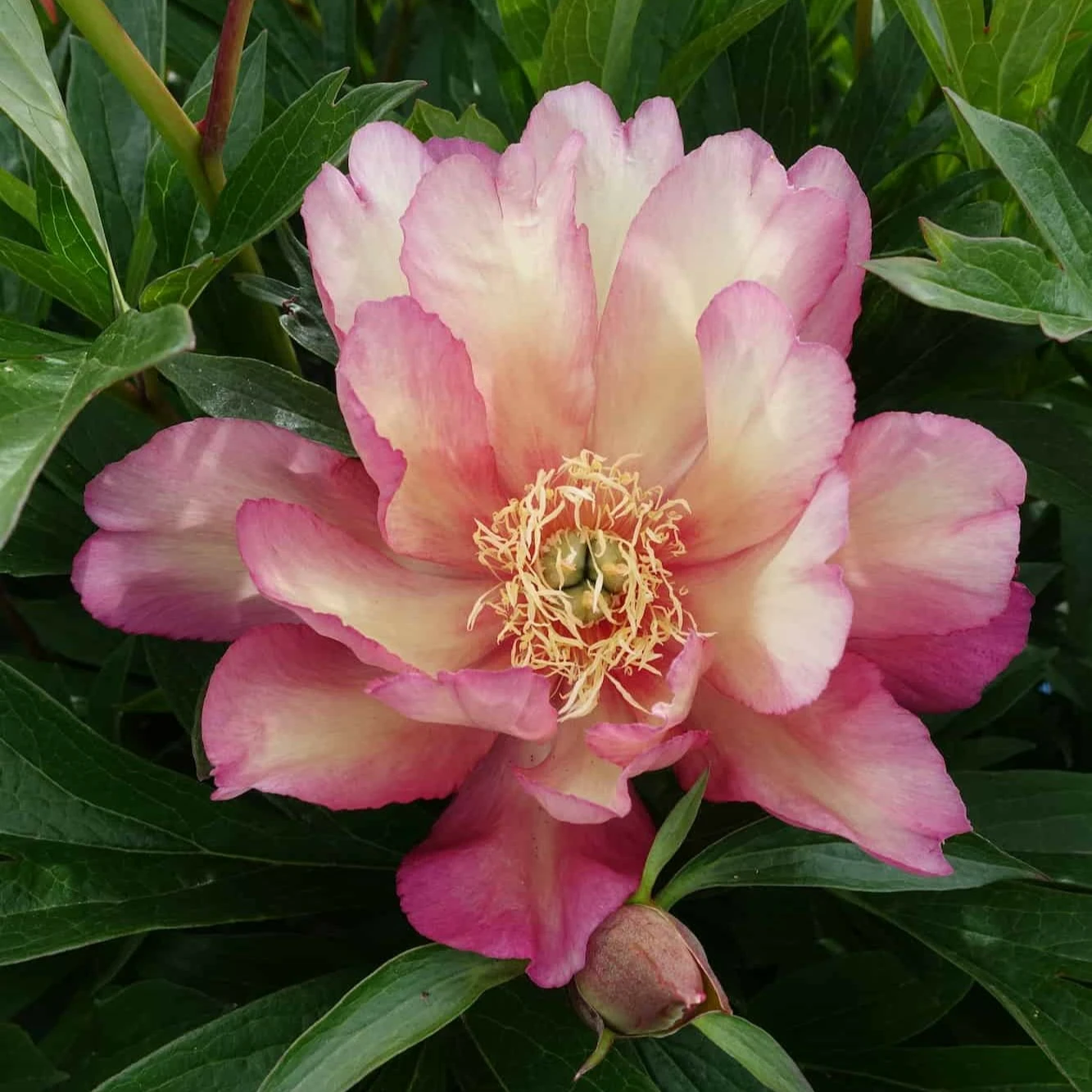 Paeonia x hybrida 'Julia Rose' is a remarkable Itoh (Intersectional) Peony celebrated for its long flowering season, strong stems and extraordinary colour-changing blooms. The flowers open as rich cherry red before transforming through shades of pink, apricot and soft yellow as they mature—often displaying several colours at once on a single plant. Blooms are half to fully double, with a light spicy fragrance and a large bud size, making them particularly striking.