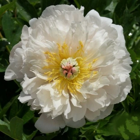 Paeonia x hybrida 'Love Affair' is a beautiful Itoh (Intersectional) Peony with elegant, semi-double to fully double blooms in creamy white flushed with the softest hints of blush pink. Each flower features a warm golden centre, creating a refined and romantic display in late spring to early summer. The petals have a silky texture and a gentle, sweet fragrance.
