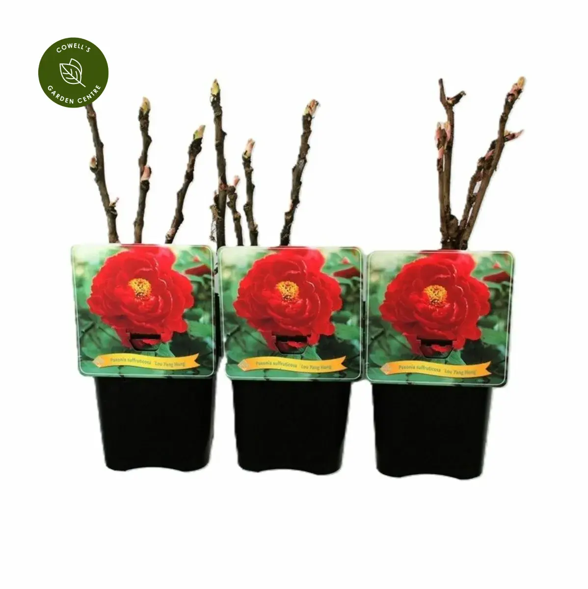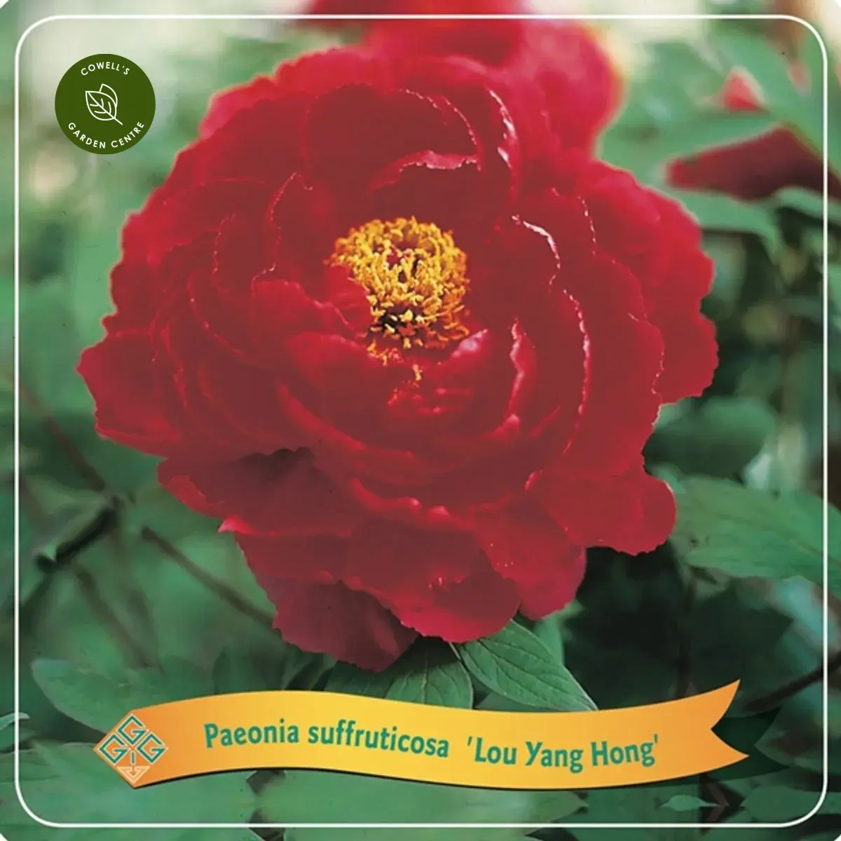 Paeonia suffruticosa 'Luoyang Hong' is a well-known and vigorous Chinese tree peony, highly prized for its spectacular blooms and rich cultural heritage. In mid spring it produces large, fully double red flowers with golden centres, creating a bold and dramatic display.