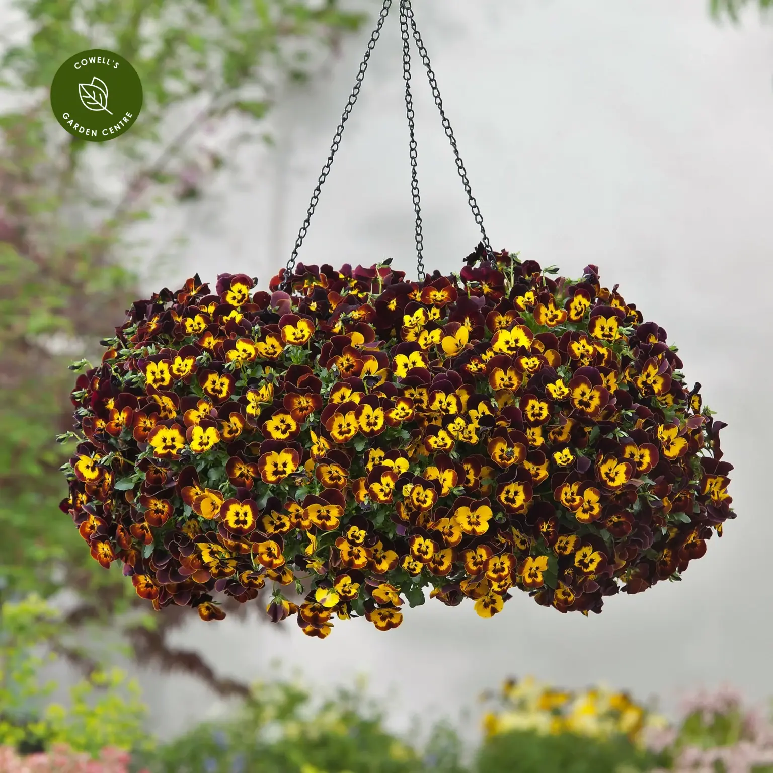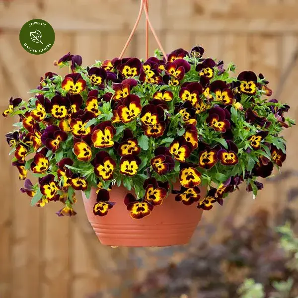 Pansy Cool Wave® 'Fire' is a vibrant trailing pansy, producing rich dark red blooms with a contrasting yellow face that bring a fiery splash of colour. Its vigorous, well-branched growth and prostrate, spreading habit make it ideal for brightening patios, baskets, and borders with long-lasting displays. Known for its outstanding overwintering performance, it provides reliable colour from autumn through to spring.