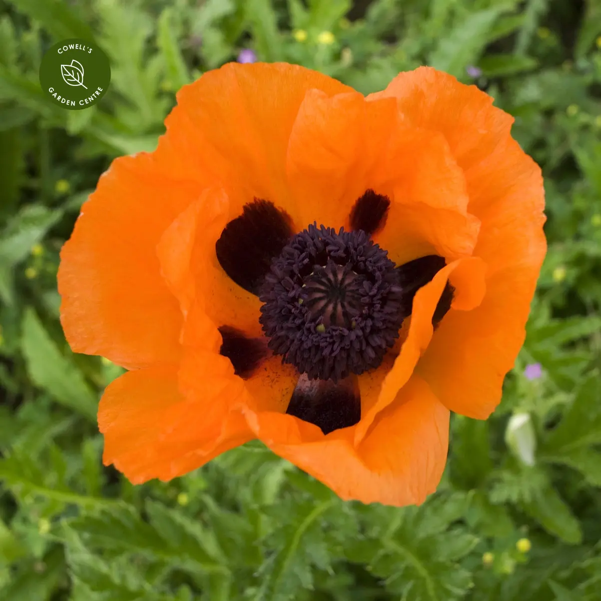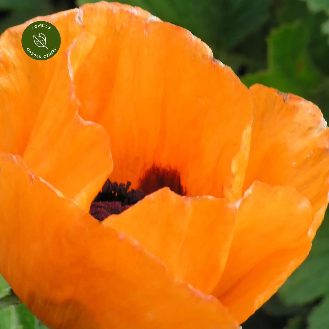 Papaver 'Prince of Orange' is a spectacular Oriental poppy, producing huge, vibrant tangerine-orange blooms with a crepe-like texture and satiny finish. Each flower features a striking central black seed capsule surrounded by deep purple stamens, creating a bold and dramatic display.