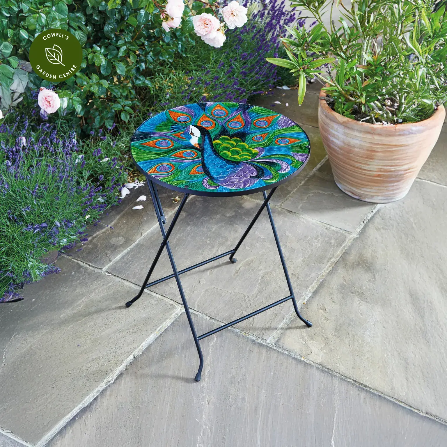 Add a decorative touch to your space with this peacock design glass table, featuring a beautifully hand-painted top. Ideal for use in the garden, on patios or indoors, it offers both style and practicality with a foldable base for easy storage.