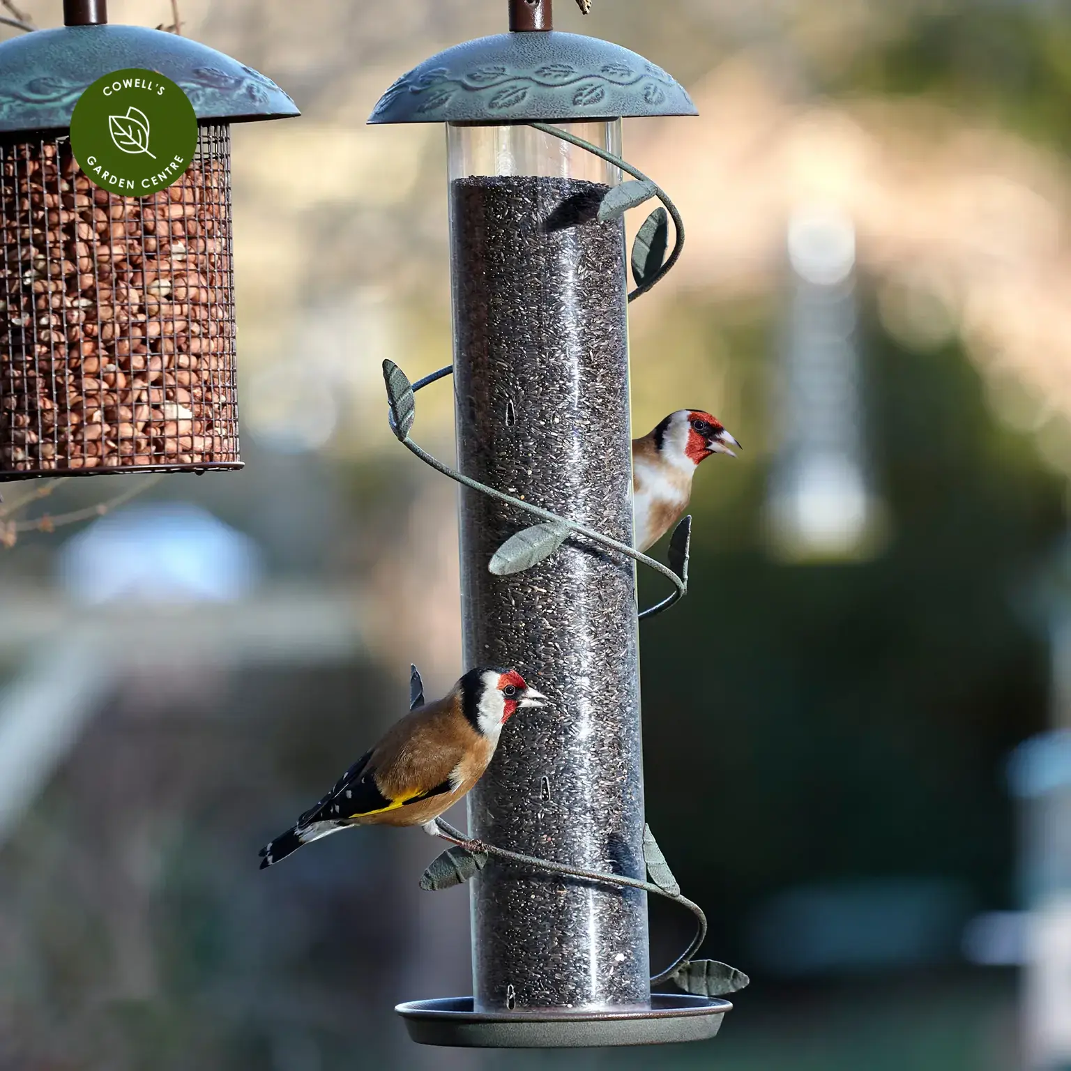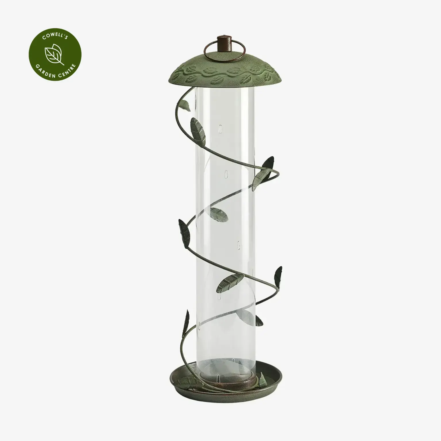 The Peckish Secret Garden Spiral Finch Feeder is a decorative feeder with an antique finish, perfect for nyger seed mixes. It features a seed tray to prevent mess and waste.