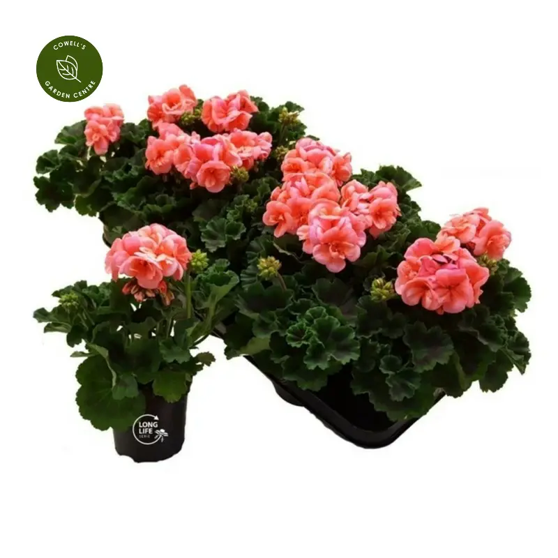 Pelargonium 'Longlife Salmon' is a vibrant, long-flowering bedding plant producing clusters of soft salmon-pink blooms above rich green foliage. Bred for exceptional performance, it offers continuous colour and excellent durability throughout the season.