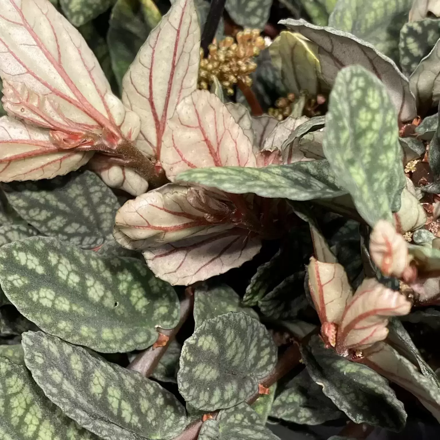 Pellionia pulchra is an attractive trailing plant grown for its striking marbled foliage and exciting colouration. The upper leaves display a beautiful mosaic of olive-green and silver-grey, while the undersides contrast dramatically in cream with vivid pink veins. The colouration becomes more intense when the plant receives a touch of gentle direct sunlight.