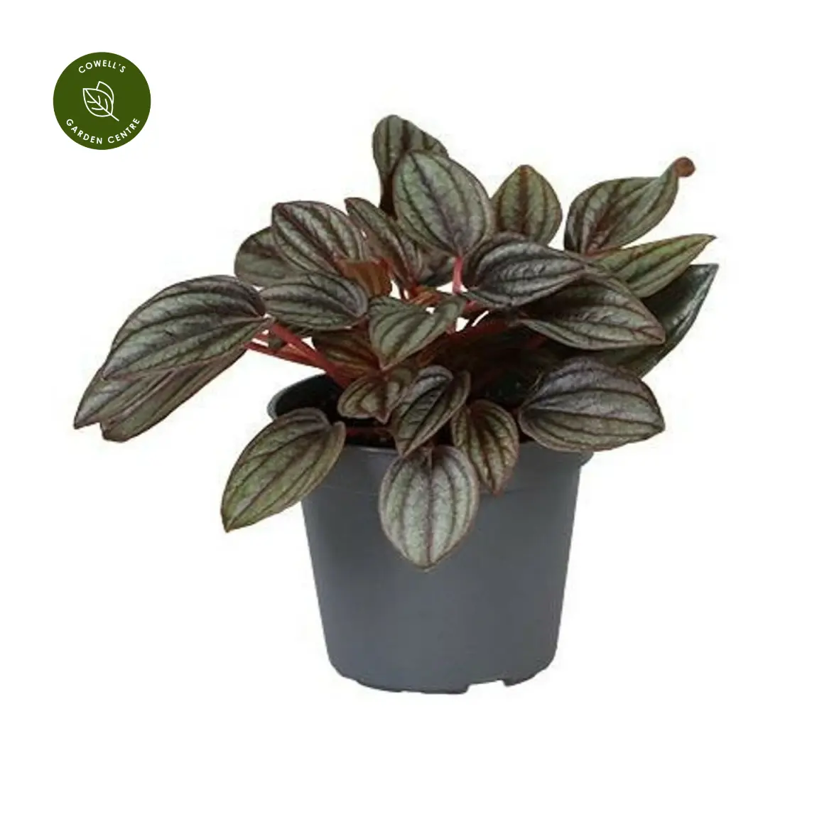 Peperomia 'Lima' is a compact houseplant with deeply textured, heart-shaped leaves in cool green, highlighted by darker veining and vivid red undersides. Its stunning, contrasting colouring and crinkled foliage bring a fresh, tropical touch to desks, shelves, or terrariums.