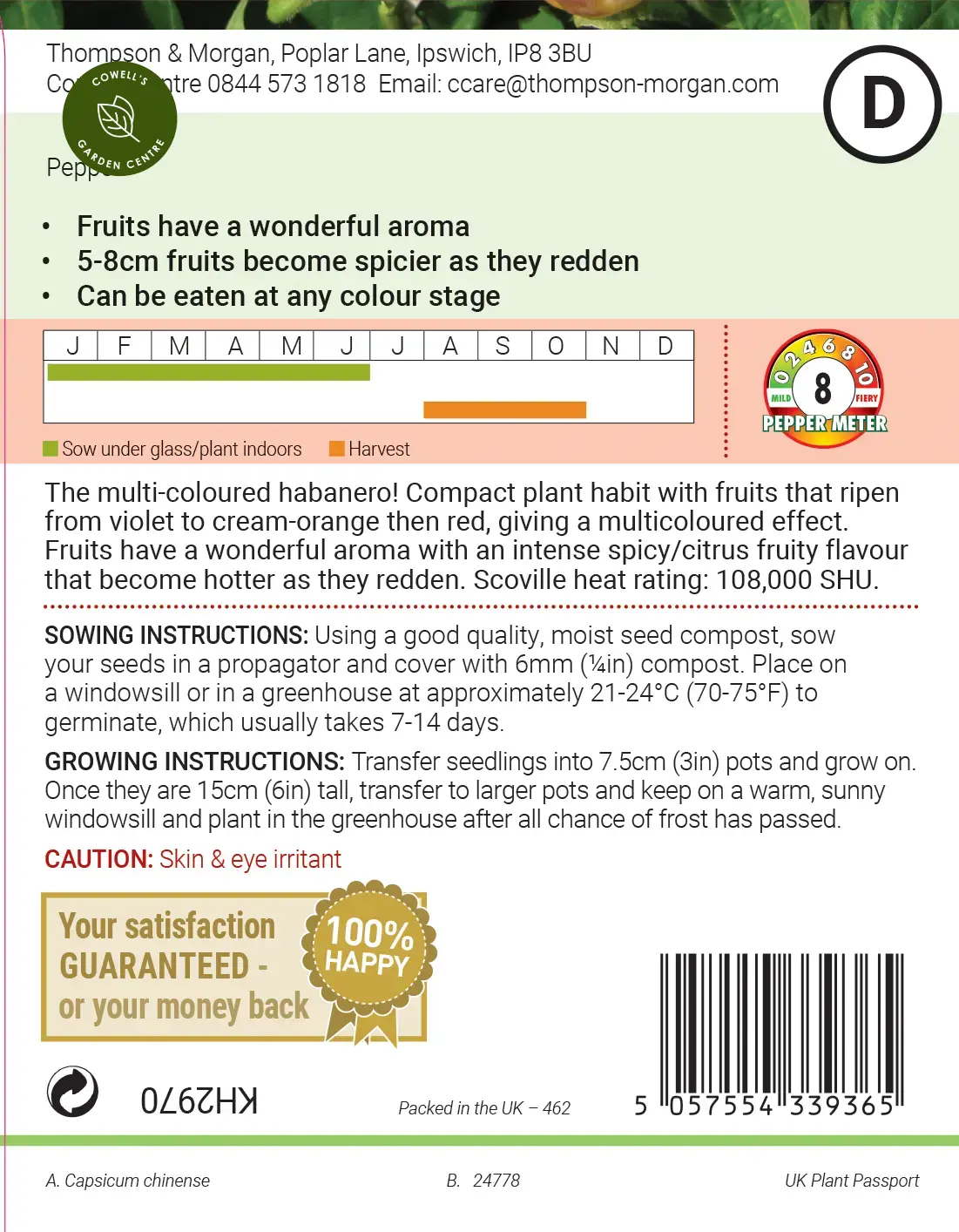 The violet fruits are the mildest, with heat intensifying as they redden but still retaining the classic fruity citrus notes of the Habanero. Measuring 5–8?cm long by 2–4?cm wide, these vibrant fruits both look and taste great—a perfect greenhouse showstopper for heat lovers! SHU:108,000. Ultimate height: 60cm (24in). Ultimate spread: 40cm (16in).