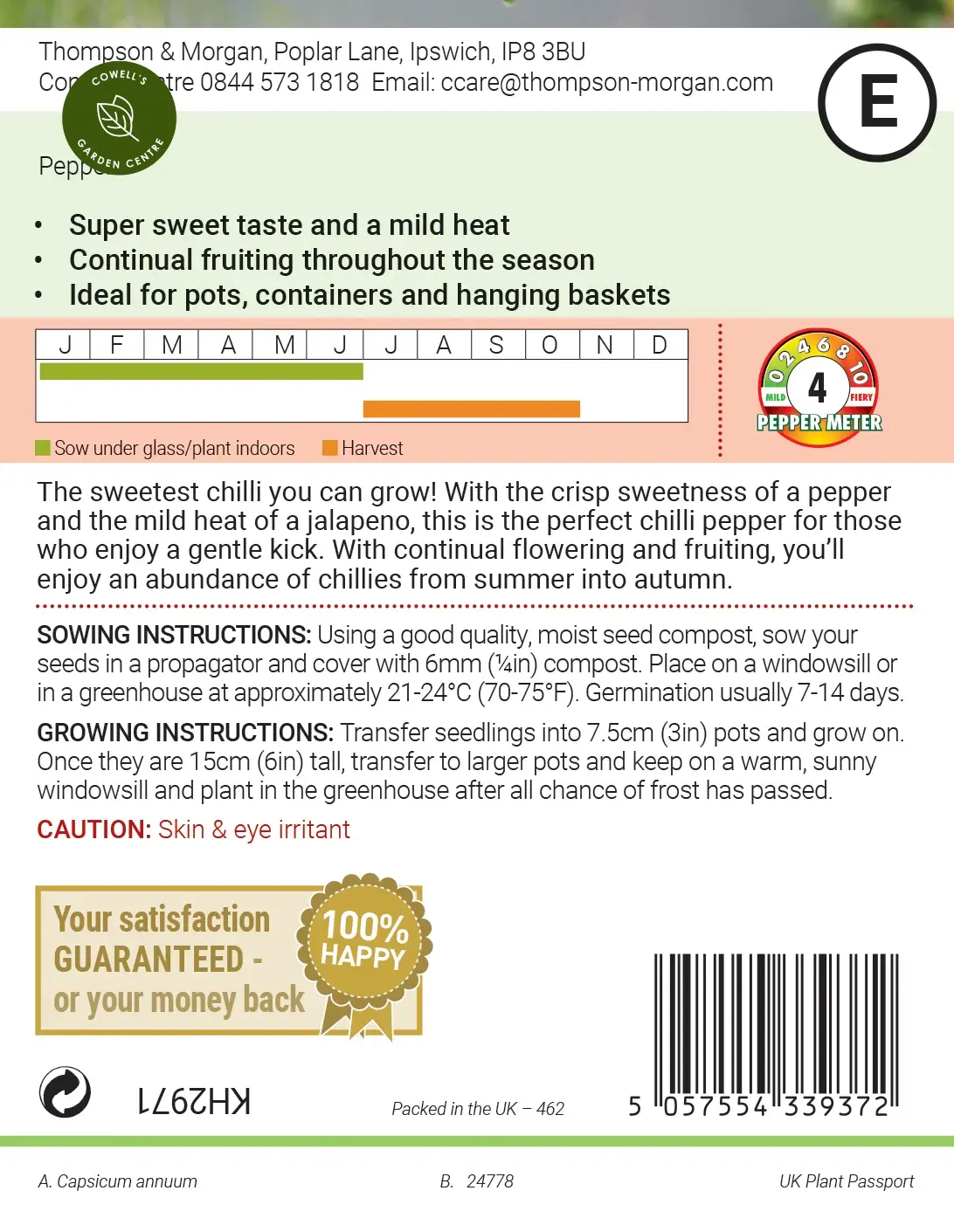 With continuous flowering and fruiting it produces generous harvests from summer to autumn. A top choice for those who enjoy a hint of heat without overwhelming spice. Ultimate height: 25cm (10in). Ultimate spread: 30cm (12in).