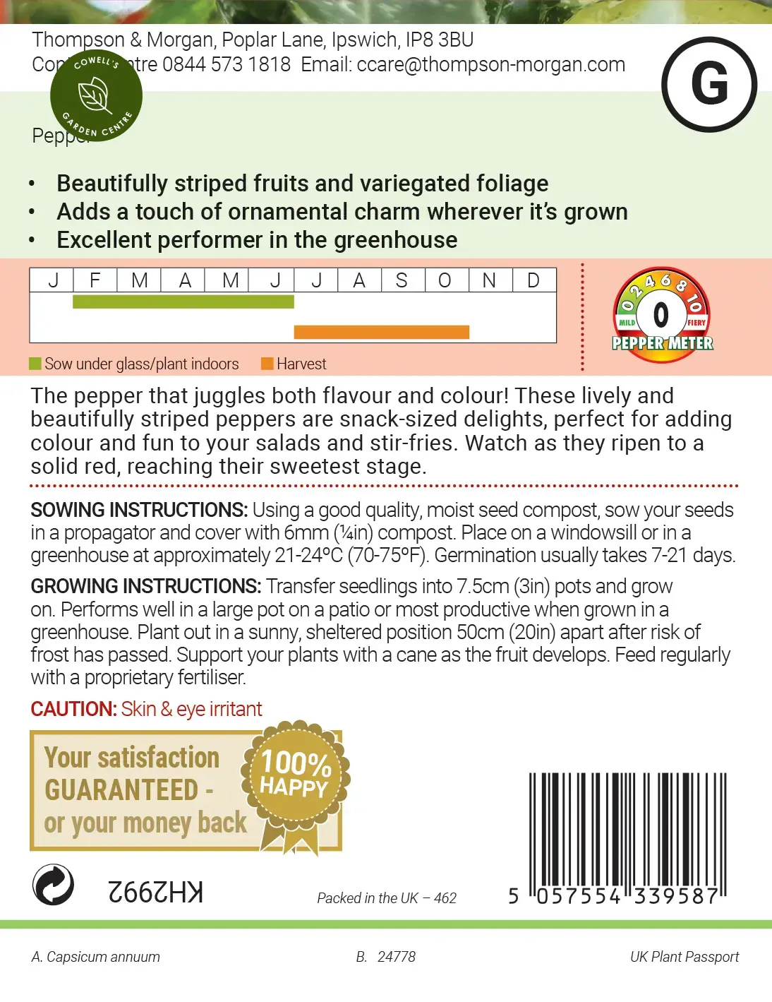 The red, yellow and green striped fruits of Sweet Pepper 'Jester' are sure to entertain you, along with its eye catching foliage with cream variegation. The snack-size peppers can be picked at any stage - their sweetness intensifying as they ripen to solid red - adding fun and flavour to salads, stir fries and appetisers.
