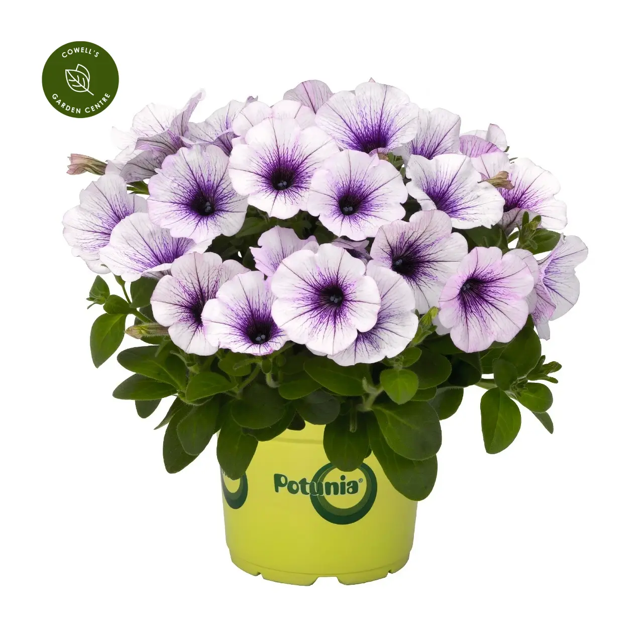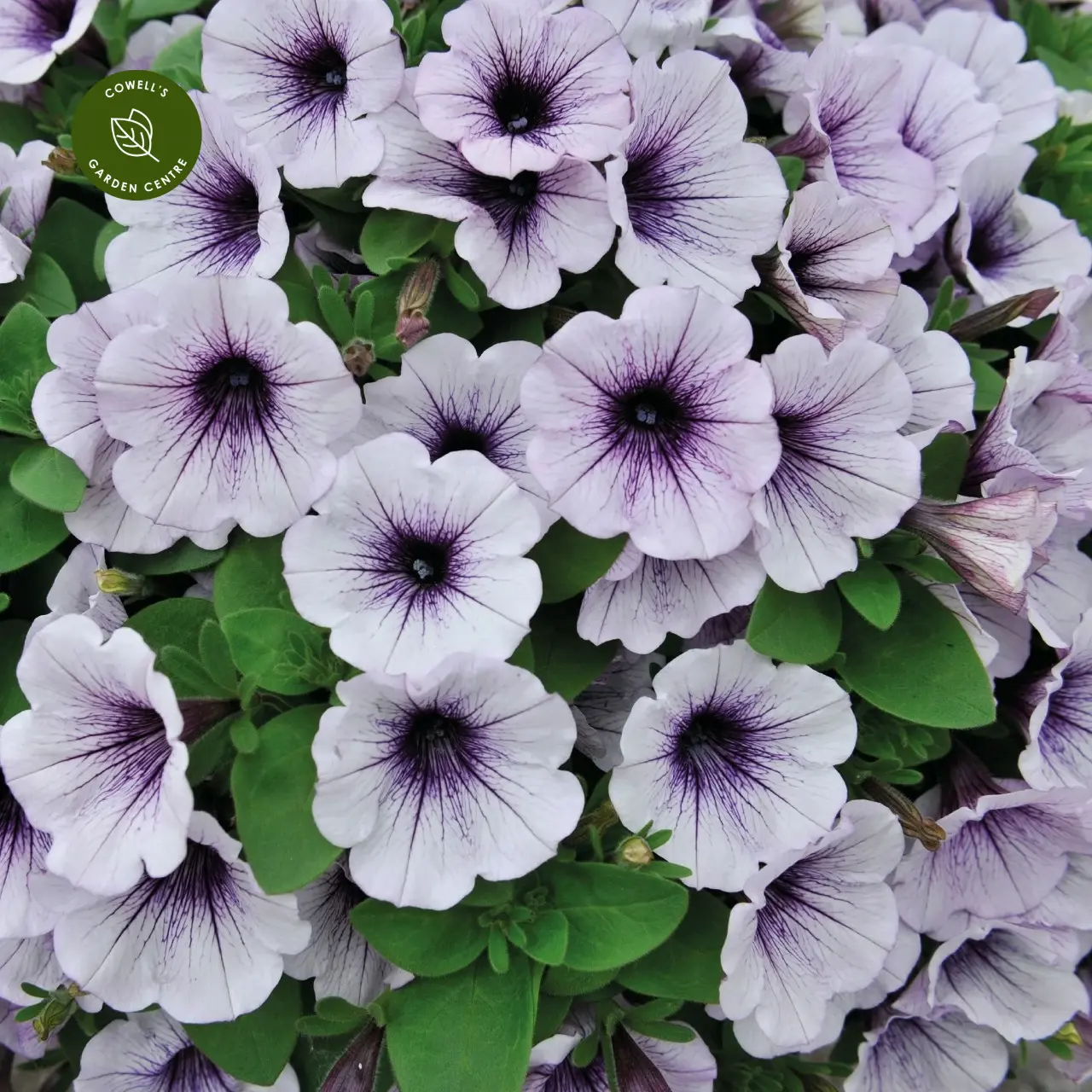 Petunia ‘Potunia® Piccola Blue Ice’ is a beautifully compact, free-flowering variety producing masses of soft, pale lilac-white blooms with striking deep purple veining and centres. The intricate patterning creates a delicate yet eye-catching display, perfect for adding detail and contrast to summer planting schemes.