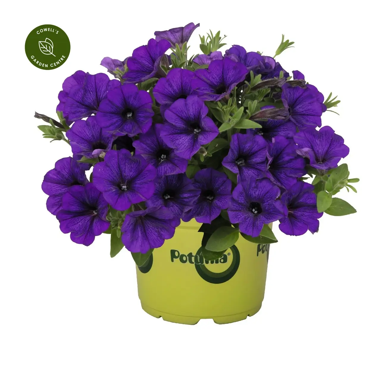 Petunia ‘Potunia® Piccola Cobalt Blue’ is a striking compact variety featuring rich, velvety deep blue-purple blooms with dark centres that create a bold, dramatic display. The intense colouring adds depth and contrast, making it a standout choice in summer planting.