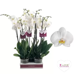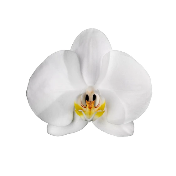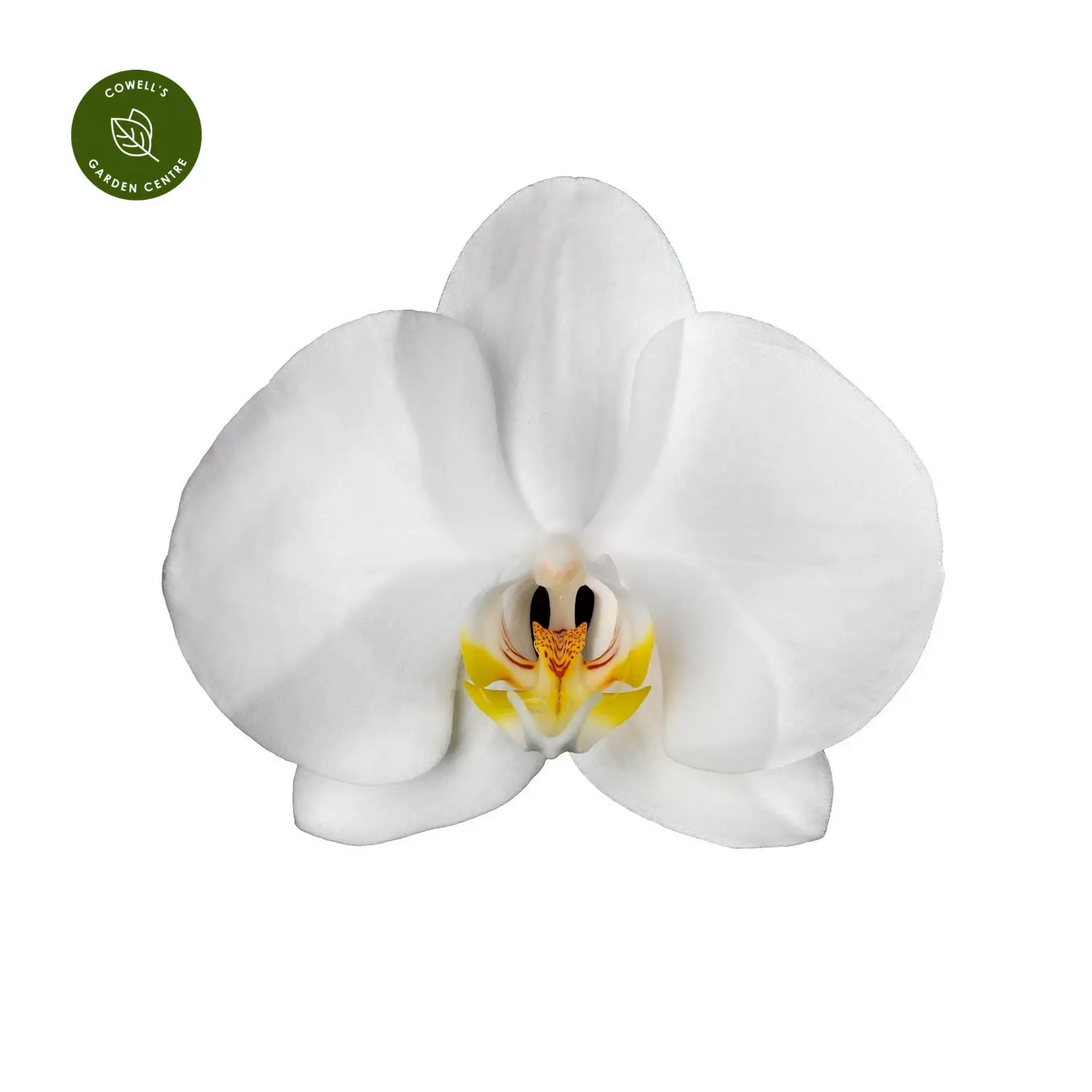 Phalaenopsis 'Cambridge' is a refined moth orchid with tall, arching stems that carry clusters of pure white blooms, each accented by a soft yellow centre and delicate magenta blush at the lip. Its timeless elegance and graceful habit make it a favourite choice for brightening any interior with simple sophistication.