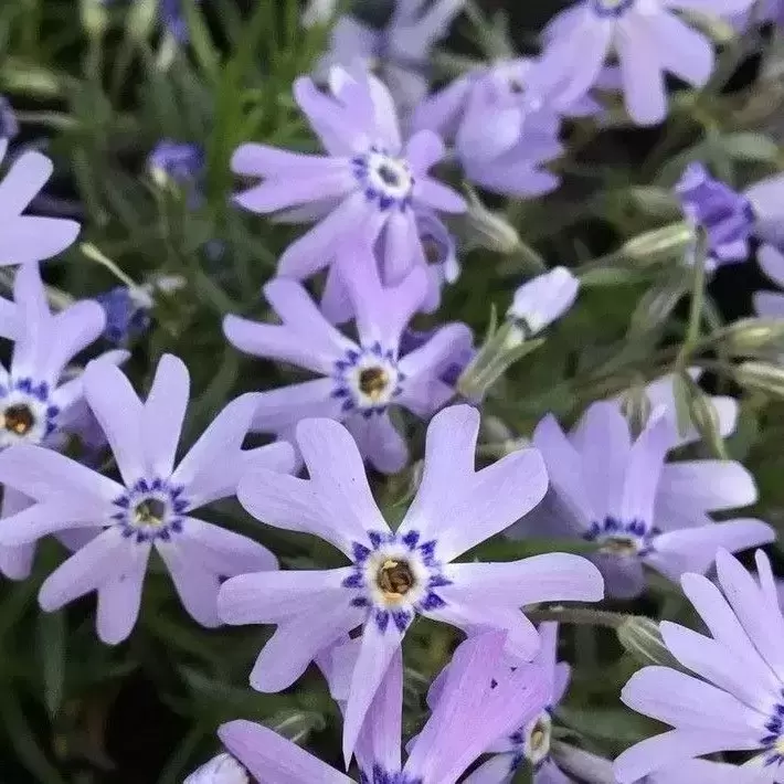 Phlox subulata 'Fabulous Blue Violet' is a low-growing, spreading alpine perennial that forms a dense cushion of fine, evergreen foliage. From April to June, it produces a profusion of pale violet-blue flowers with dark eyes, creating a carpet of colour that brightens rockeries, walls, banks, and containers.