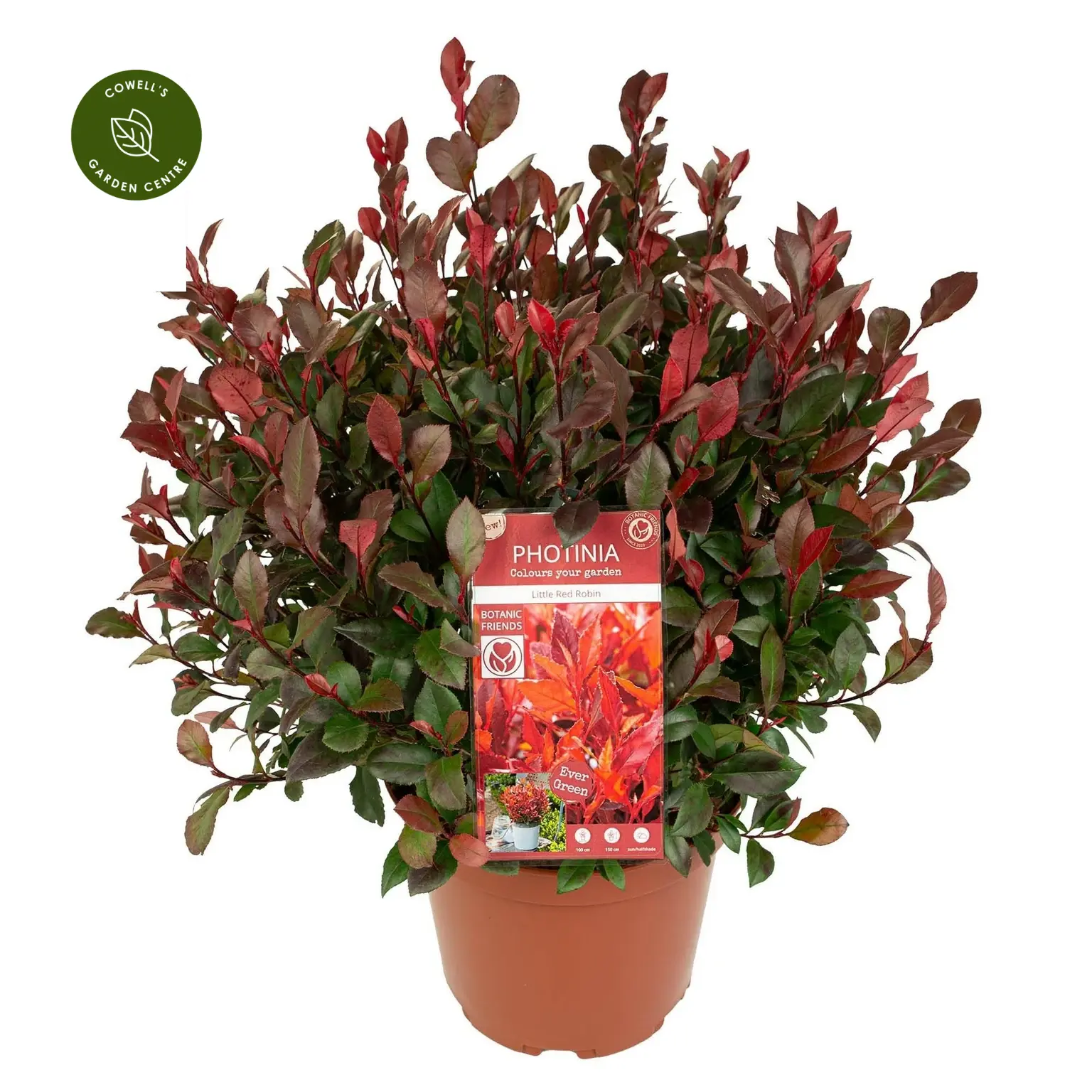Photinia x fraseri 'Little Red Robin' is a compact, dwarf variety of the popular Red Robin, prized for its vibrant red new growth that matures to a glossy deep green. Its neat and bushy habit makes it an ideal choice for smaller gardens, patios, or containers where space is limited. The evergreen foliage provides colour and structure throughout the year, while the striking red flushes of young leaves create a bold seasonal highlight.