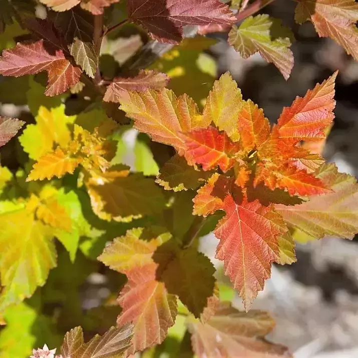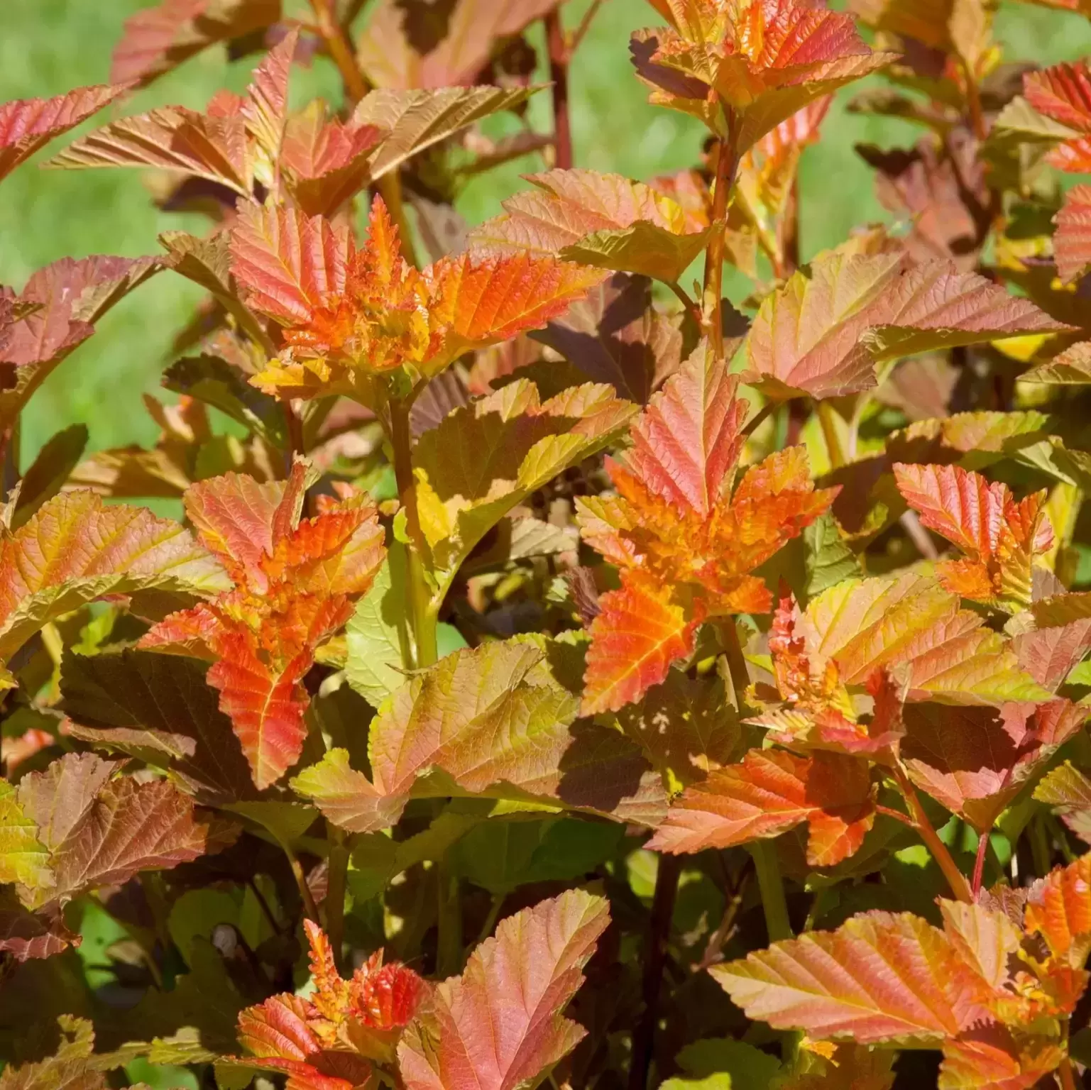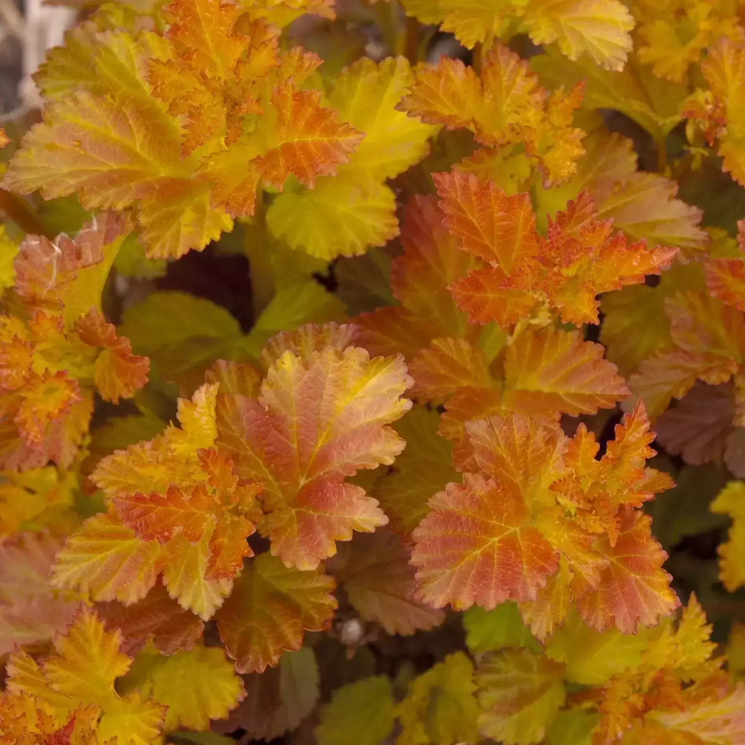 Physocarpus 'Amber Jubilee'™ stands out in the garden border or makes an eye-catching hedge, with it's rounded and dense in habit with a bold array of colours in glowing tones of orange, yellow and gold. Clusters of delicate white blooms in spring and autumn add extra interest. Plant in full sun for best performance.