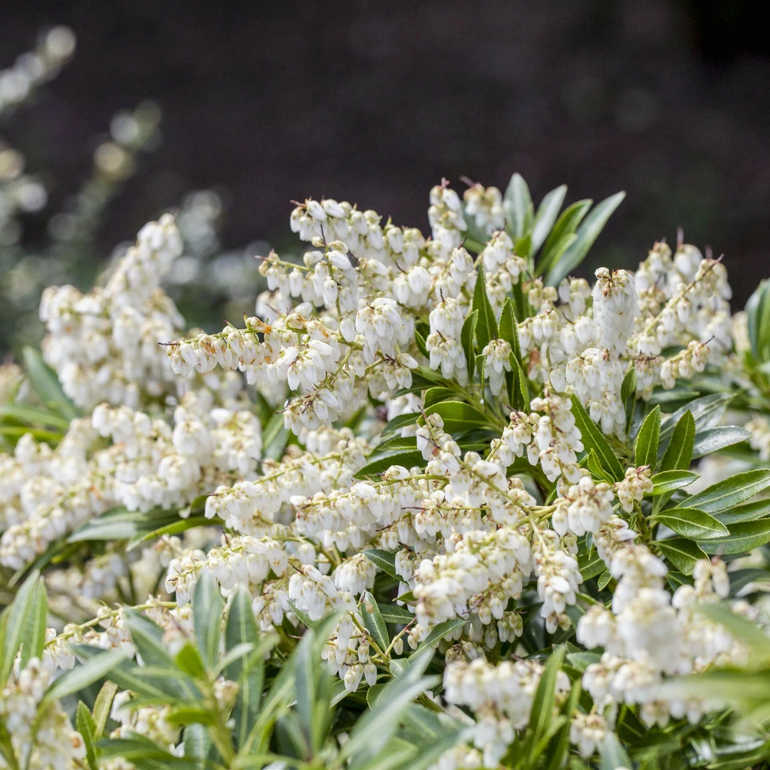 Pieris 'Cupido' is a compact, evergreen shrub prized for its elegant form and year-round appeal. In early spring, it produces masses of delicate, bell-shaped white flowers that hang in cascading clusters above glossy, dark green foliage. New growth emerges with soft bronze tones before maturing to rich green, providing seasonal interest even after flowering.