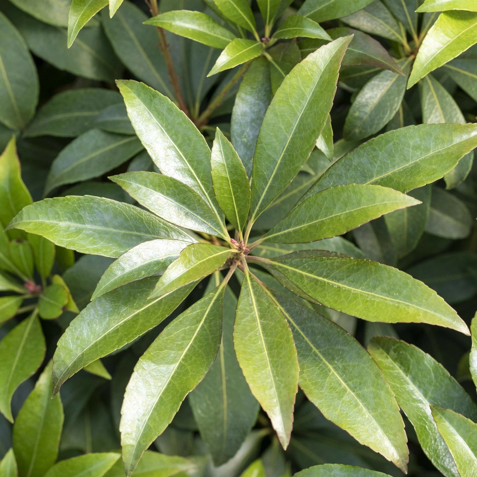 - Compact, evergreen shrub with glossy green foliage