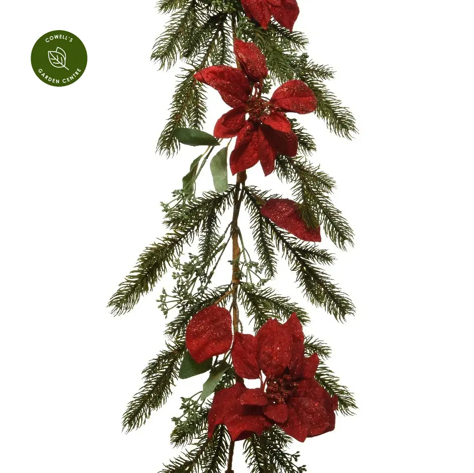 The Poinsettia Glitter Garland has a soft needle effect, decorated with glittery Poinsettia heads for a festive feel.