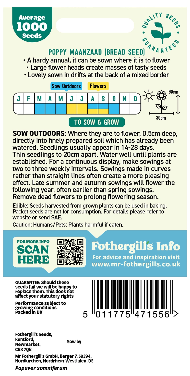 The best poppy seed for baking. Always sow poppies direct in their flowering position as their long taproots mean that they do not transplant easily.