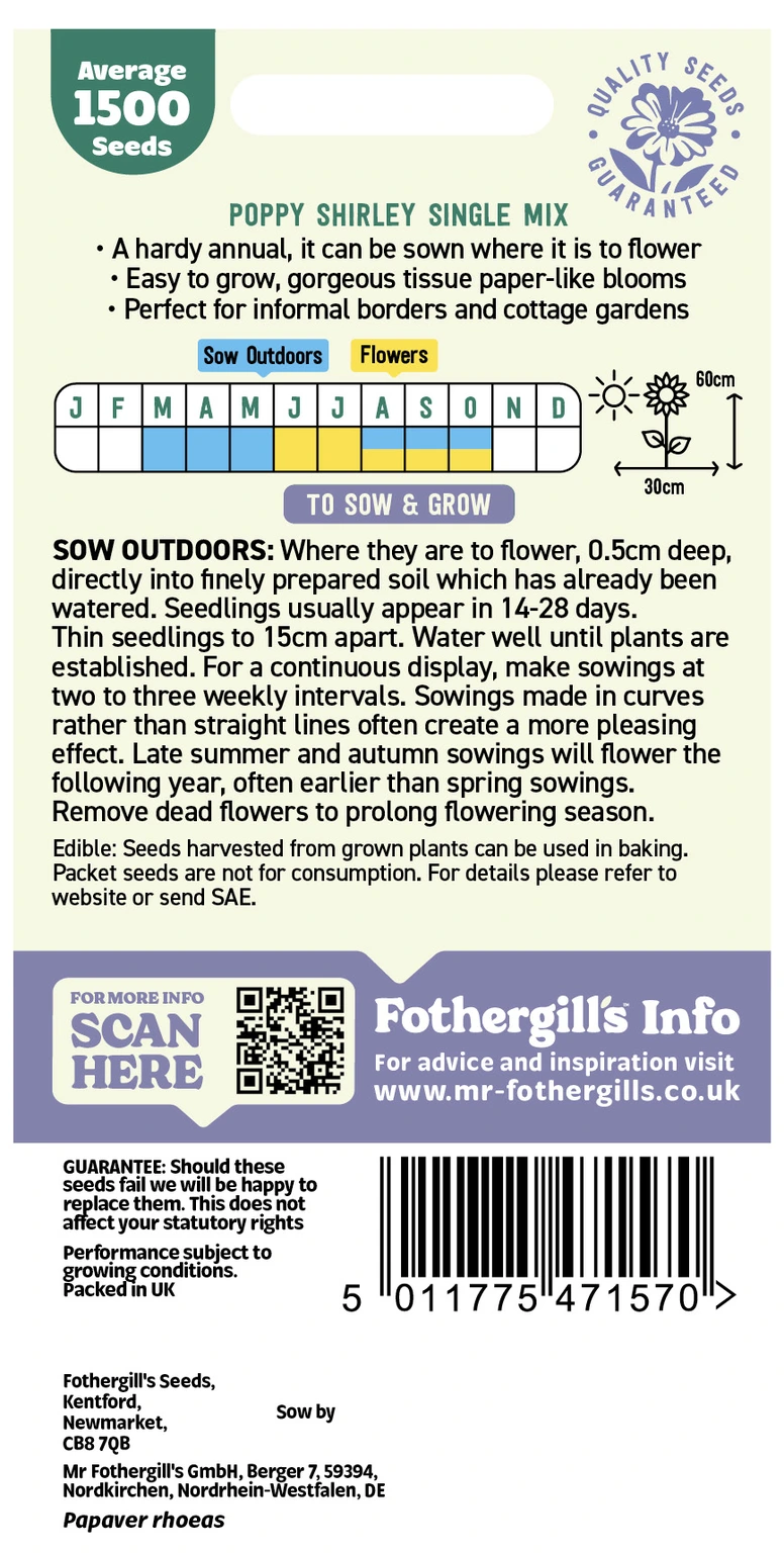Charming and so easy to grow. Cloche protection of seedlings overwinter is beneficial. Sow these poppies direct in their flowering position as their long taproots mean that they do not transplant easily.