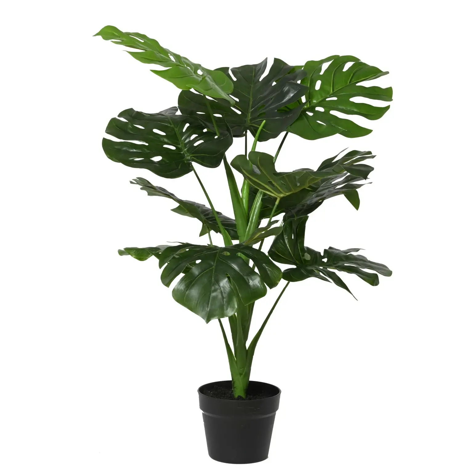 Realistic artificial Monstera with glossy, fenestrated green leaves, presented in a simple black pot to add bold, tropical style to interior spaces.