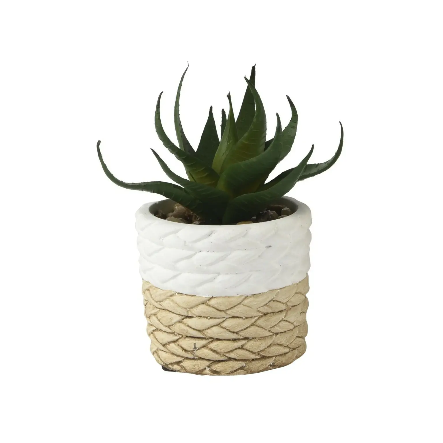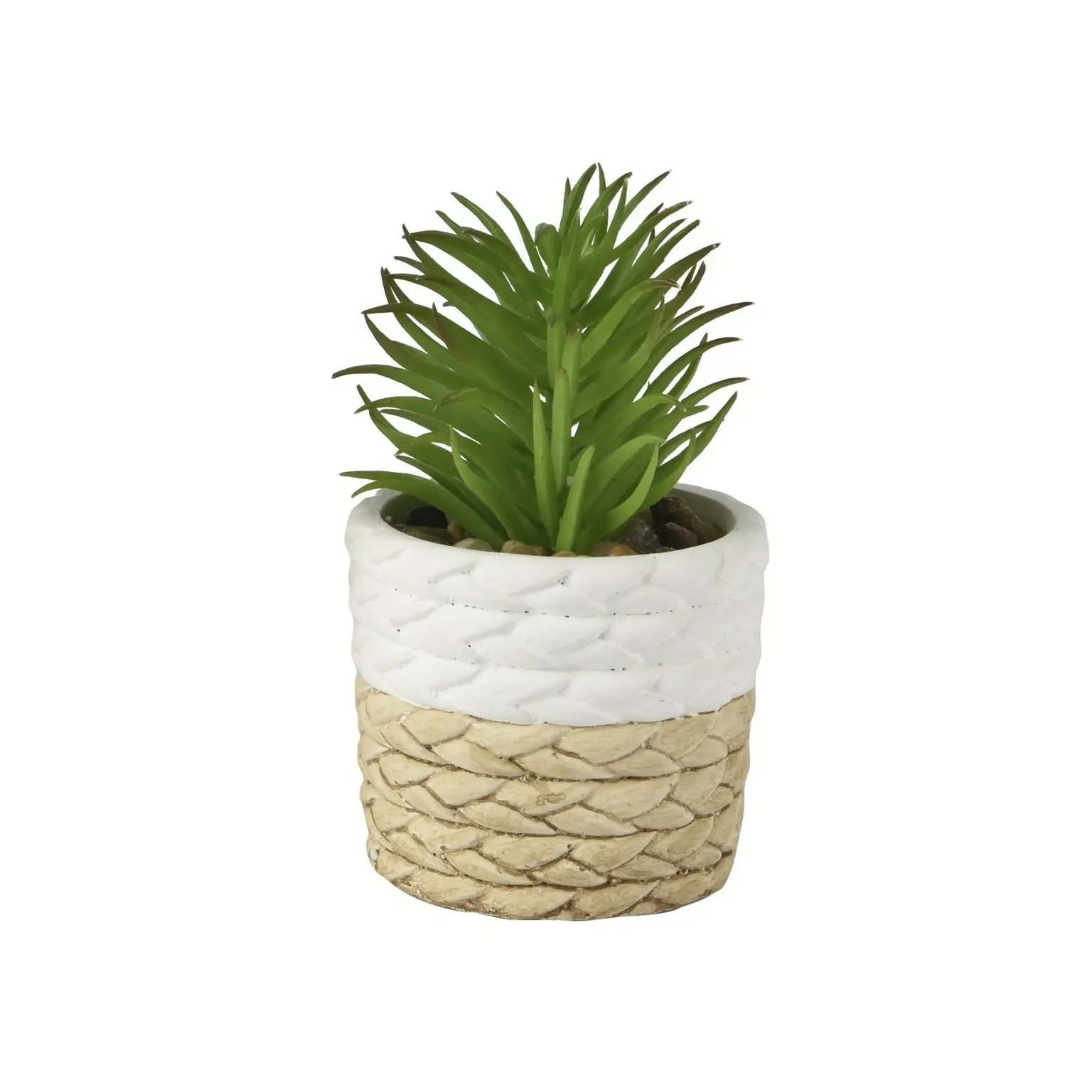 Realistic artificial green succulent presented in a woven effect stone pot, ideal for compact indoor styling.