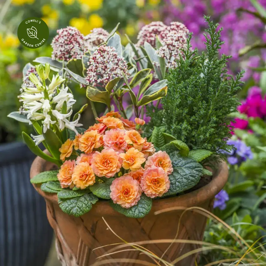 Primula Belarina® 'Sweet Apricot' is a charming spring perennial, producing masses of fully double apricot-coloured blooms with a delightful fragrance. Flowering from February to May, it provides a long-lasting splash of soft colour at a time when few other plants are in bloom. Its compact, low habit makes it perfect for brightening pots, containers, and the front of borders.