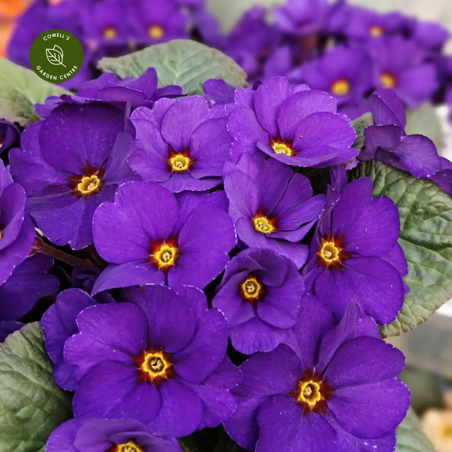 Primula 'Obsidian Blue' is a striking evergreen primrose producing deep violet-blue flowers with contrasting golden centres. The richly coloured blooms sit just above neat rosettes of textured green foliage, creating a bold splash of colour in late winter and early spring.