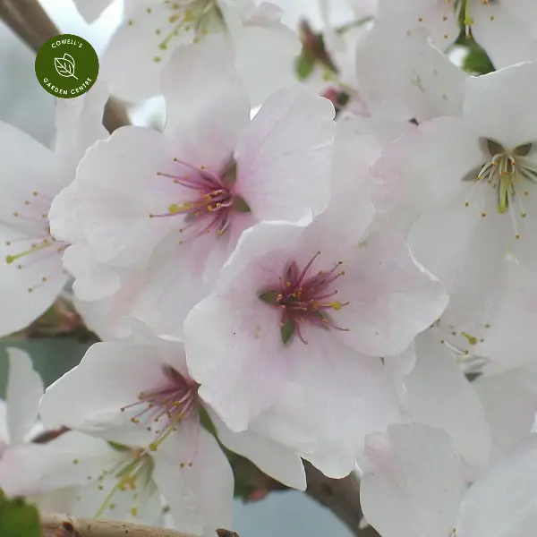 Prunus incisa 'The Bride' is a compact, deciduous ornamental cherry prized for its abundant spring blossom and neat habit. From March to April, it bursts into bloom with masses of large, single white flowers, each lightly flushed with pink at the base. The petals open wide, creating a spectacular bridal-like display that smothers the bare branches. Its early nectar-rich flowers attract bees and pollinators, providing a valuable food source at the start of spring.