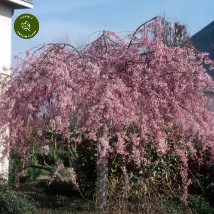 'Pendula Rubra' is a graceful, weeping cherry tree with arching branches that create an elegant cascading effect. In early spring, it produces an abundance of rose-pink, bell-shaped flowers, bringing a stunning display of colour before the foliage emerges. The delicate green leaves turn warm shades of yellow and orange in autumn, adding seasonal interest.